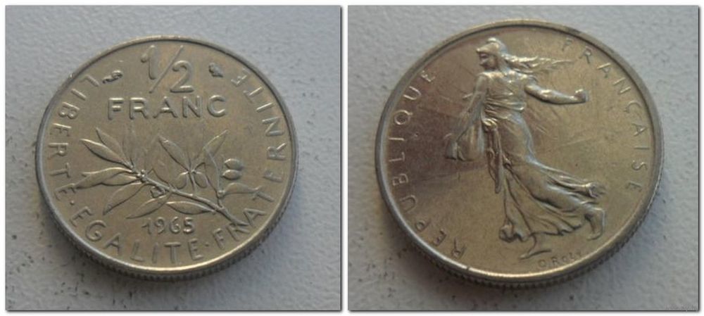 1/2 франка Франция 1965 год, KM# 931.1, 1/2 FRANC, из мешка