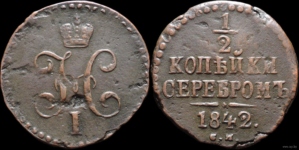 1/2 копейки 1842 СМ, Рельеф! С 1 Рубля! Смотрите другие лоты!