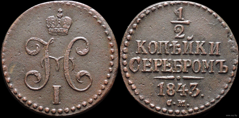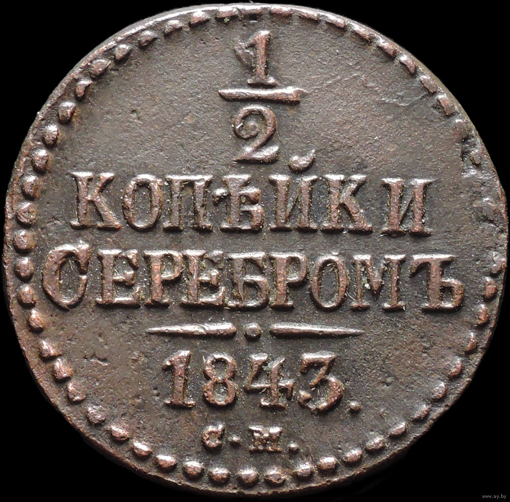 1/2 копейки 1843 СМ, Отличная! Нечастая! С 1 Рубля! Смотрите другие лоты!
