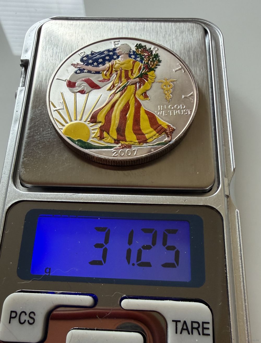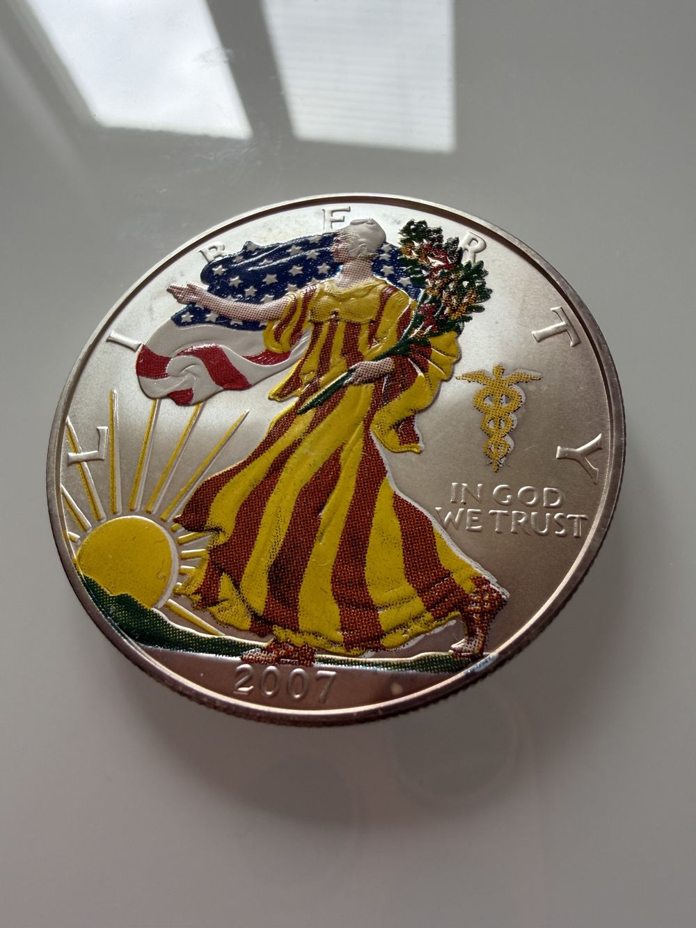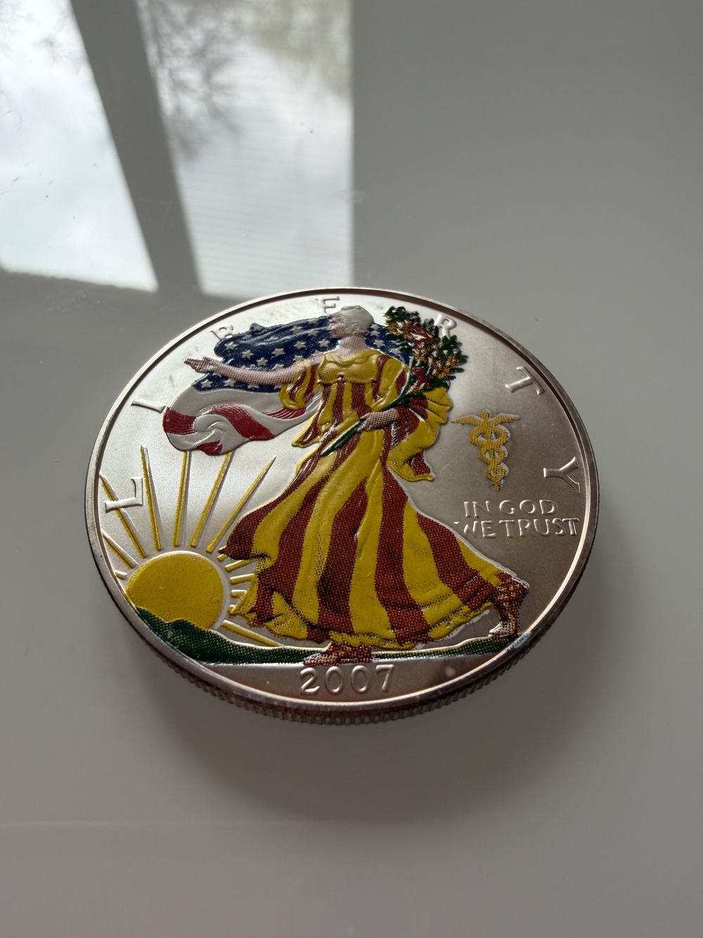 1 доллар. 2007 г. Шагающая Свобода. Цветная. США. УНЦИЯ Серебра 999 пр.