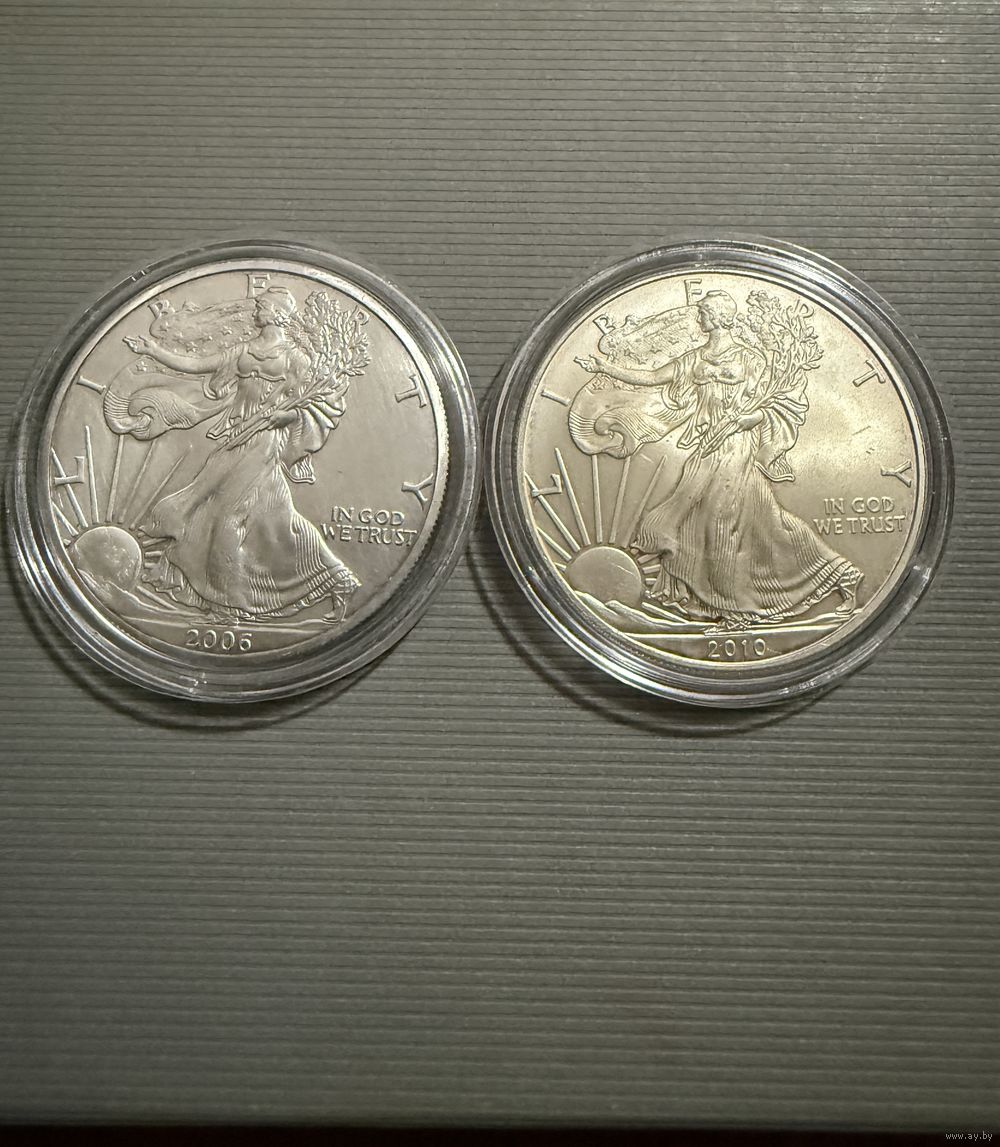 1 доллар Шагающая свобода 2006 и 2010 гг. Продаются две монеты одним лотом, лот не разбиваю. Серебро, вес 1 унция каждая. Прошу оценивать состояние по фото. Покупатель первым выходит на связь в течение 3-х дней с момента окончания аукциона, Выкуп лота в течение 5-ти дней. Почта за мой счет (мелкий пакет).