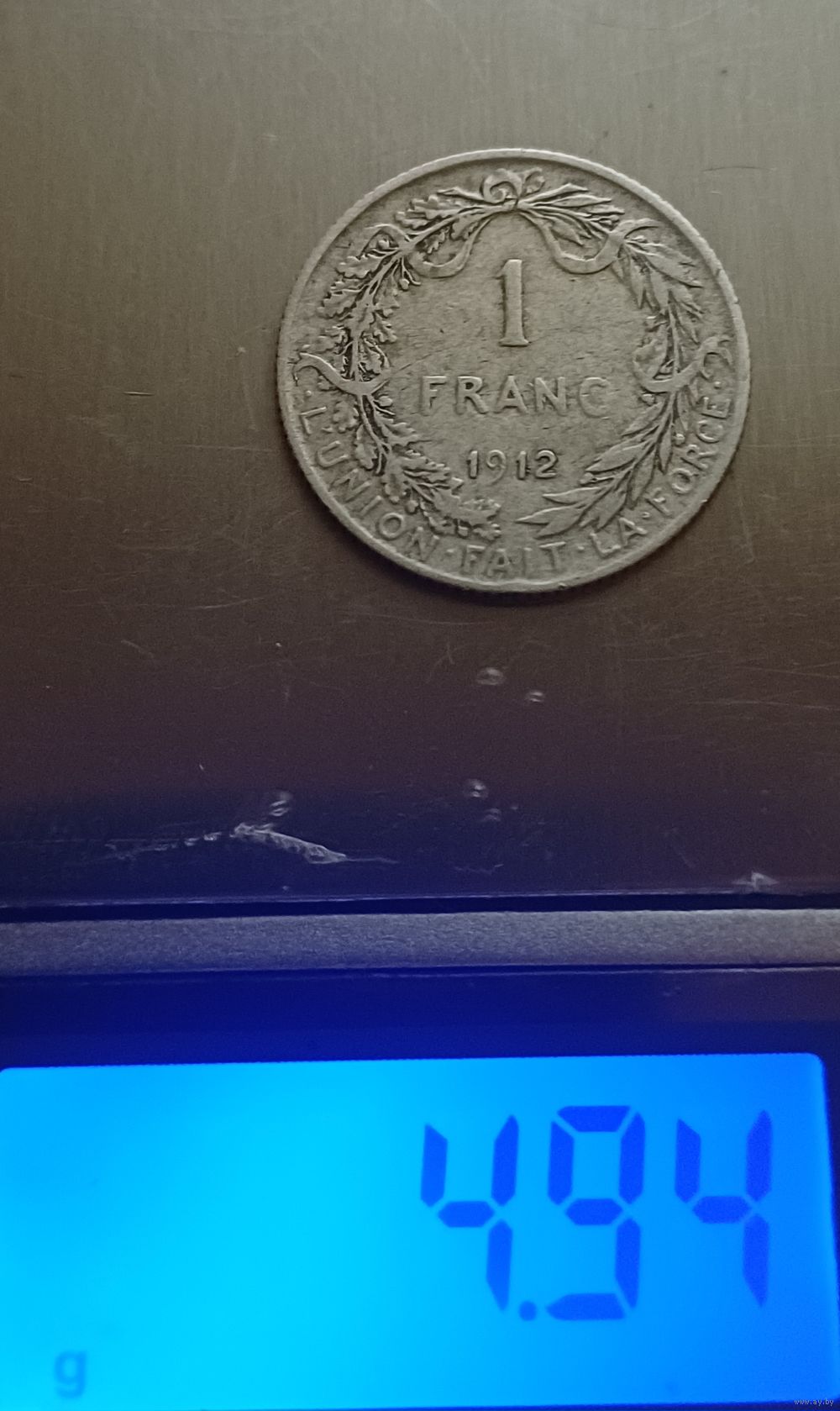 1 франк. 1912 г . 835пр., серебра. Бельгия. Король Альберт I .