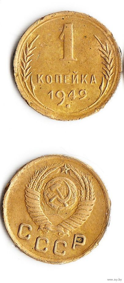 1 копейка СССР 1949 года, состояние отображено на скане.