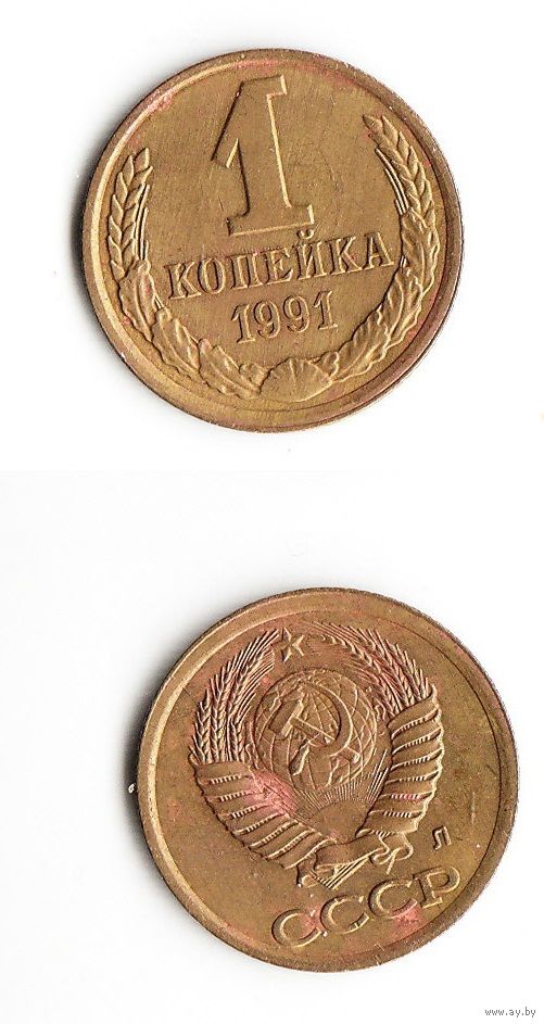 1 копейка СССР 1991 года(Л), состояние отображено на скане.