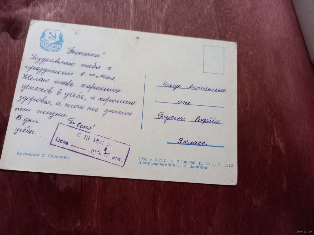 1 мая открытка 1959 Сазонов штамп "с 1-01-1961 переоценка 2 коп"