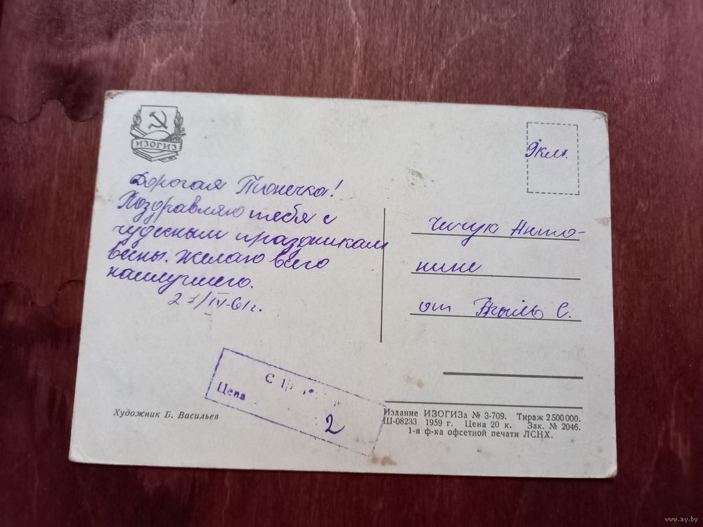 1 мая открытка 1959 Васильевич, штамп "цена с 1.01.1961 2 коп" 1
