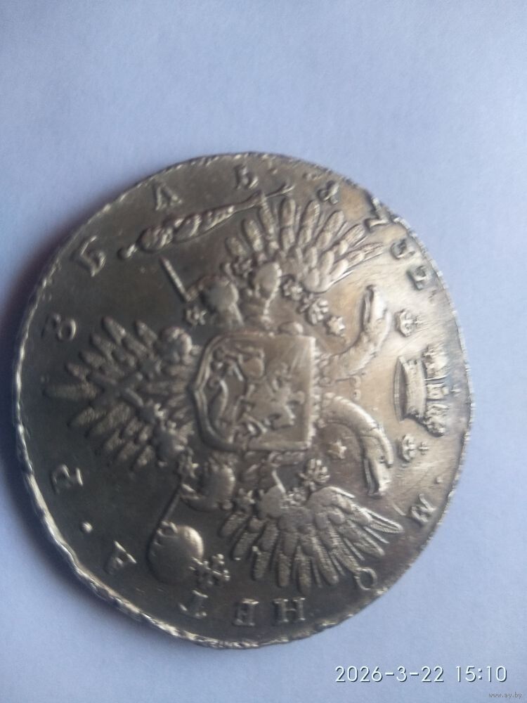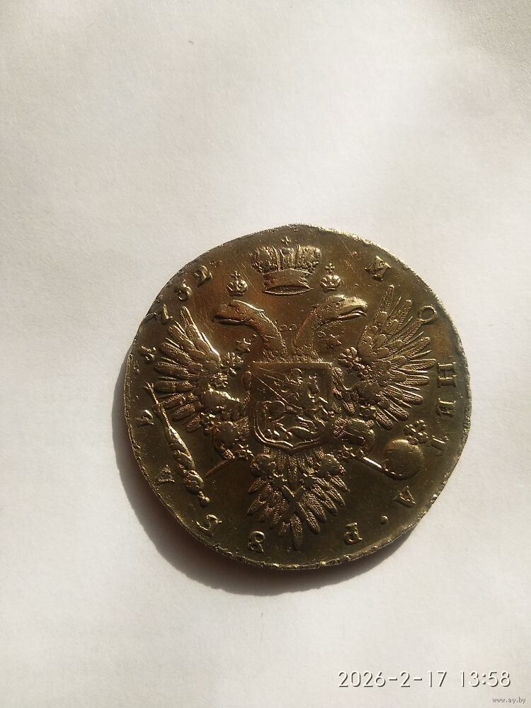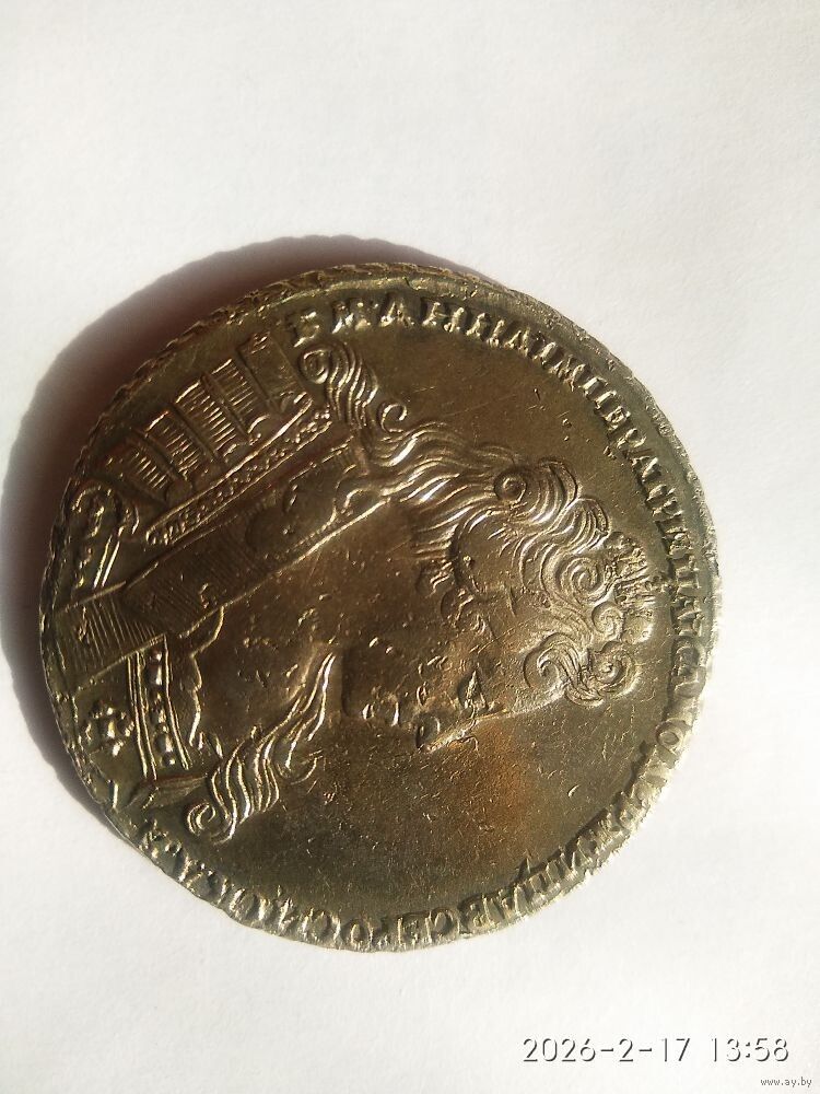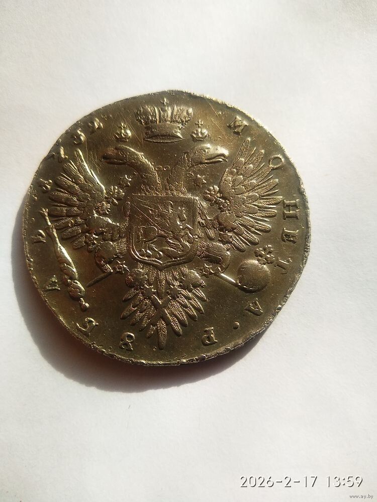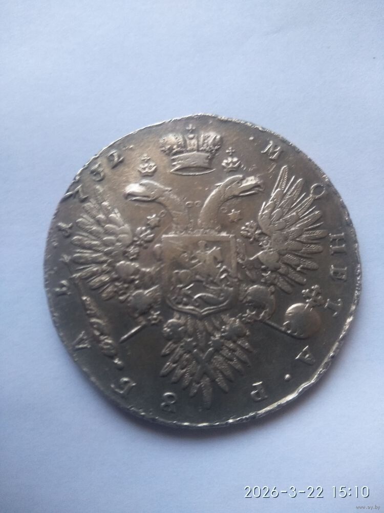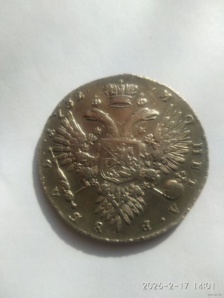Реверс В центре изображен Государственный Герб Российской империи — двуглавый орёл с поднятыми вверх распущенными крыльями, головы которого увенчаны двумя коронами, третья, большая корона над ними. На груди орла расположен Московский герб — щит с изображением Георгия Победоносца, поражающего копьём дракона. Вокруг щита орденская цепь с орденом Св. апостола Андрея Первозванного. В правой лапе орла — скипетр, в левой — держава. Вокруг орла, обращённая внутрь, надпись: «МОНЕТА РУБЛЬ 1732».С брошью на груди. Крест державы узорчатый Номинал 1 рубль Качество ОТЛИЧНОЕ Металл, проба Серебро 802 Масса общая 25,85 г Диаметр 40 мм Тираж 1487133 шт. ВЫХОД НА СВЯЗЬ 2 ДН. ОПЛАТА 3 ДН.