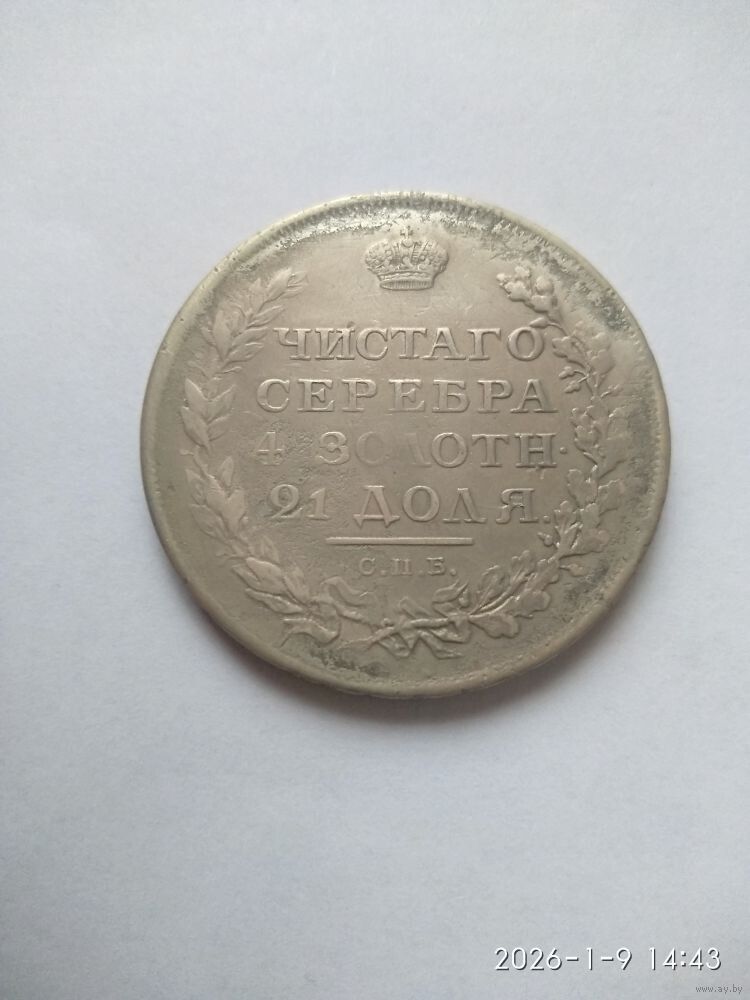 Реверс: вдоль края монеты зубчатый ободок, в середине вверху императорская корона, под ней надпись «ЧИСТОГО», ниже слово «СЕРЕБРА», под ним «4 ЗОЛОТН.» (4 золотника), ниже «21 ДОЛЯ.». Слева вдоль края лавровая ветвь, справа дубовая, внизу ветви соединяются и перевязаны лентой, над ней обозначение Санкт-Петербургского монетного двора «С.П.Б.», выше него прямая черта.
