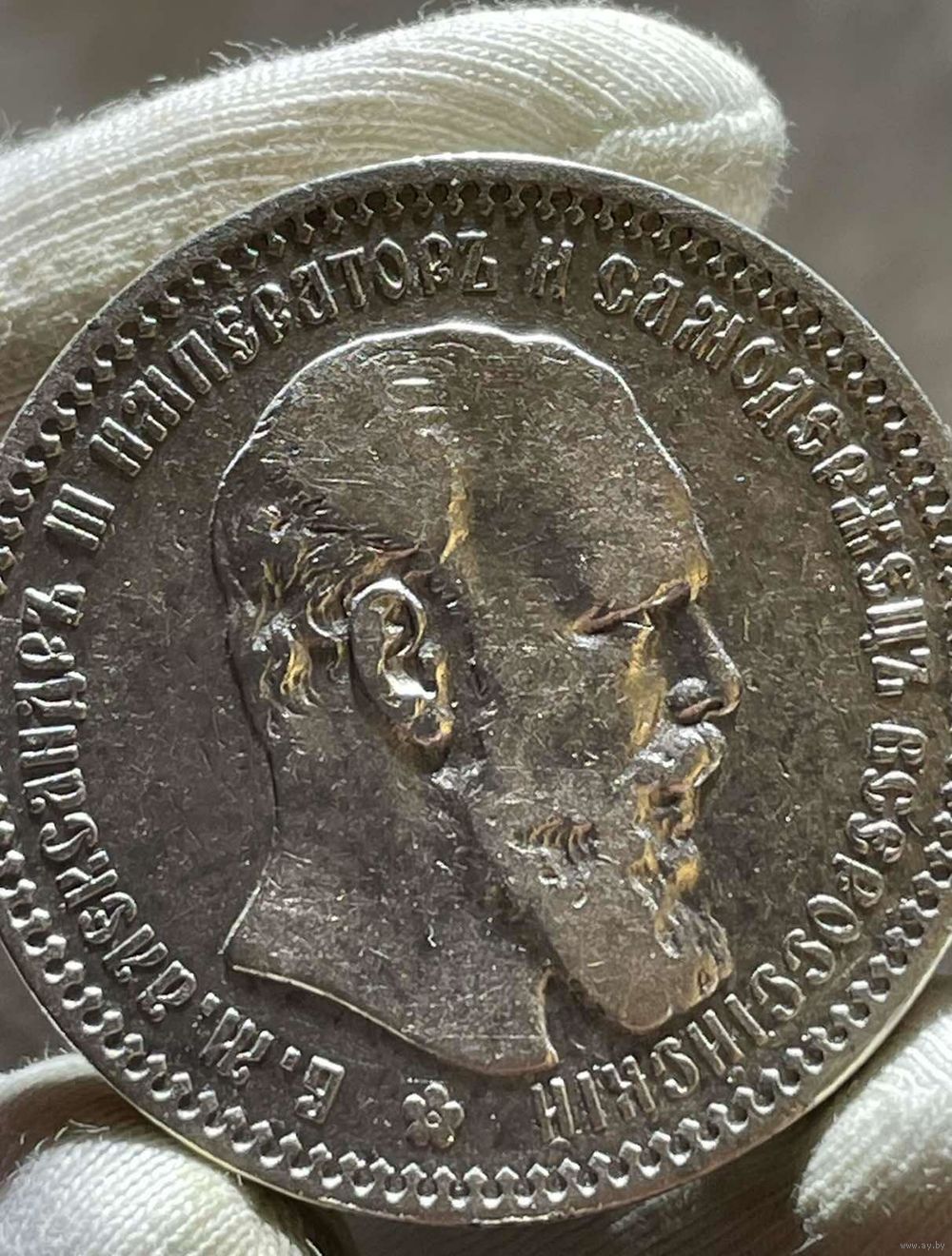 Реверс: по кругу вдоль края монеты, разделенная внизу цветочной розеткой, надпись «Б.М. АЛЕКСАНДР III ИМПЕРАТОР И САМОДЕРЖЕЦ ВСЕРОССИЙСКИЙ», в середине обращенная вправо голова Императора Российской империи Александра III.