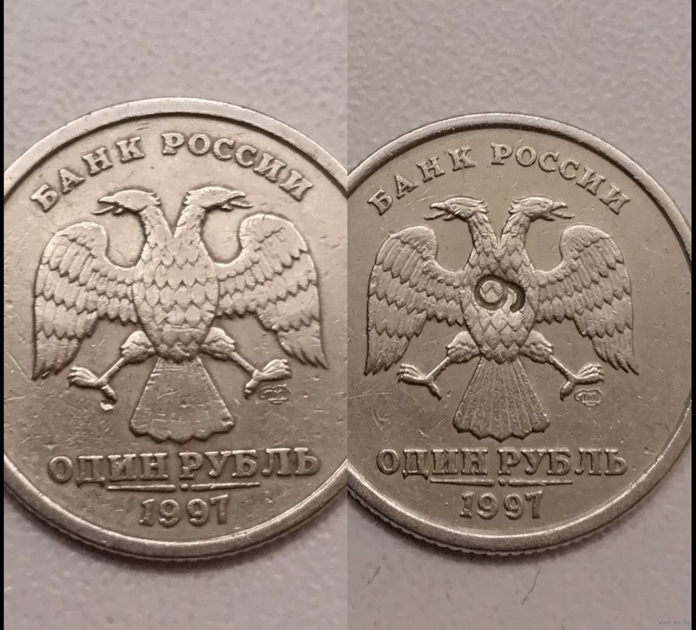 Пробный двуглавый орёл с цифрой монетного двора в центре. Денежная реформа 1998года. Рубль отличается от основного тиража: туловище, шея, буквы, объёмы рисунка, и т.п.