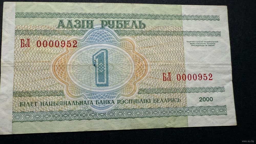 1 рубль 2000 год, серия БЛ, красивый номер 0000952