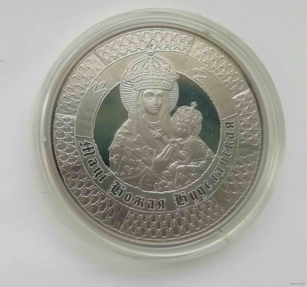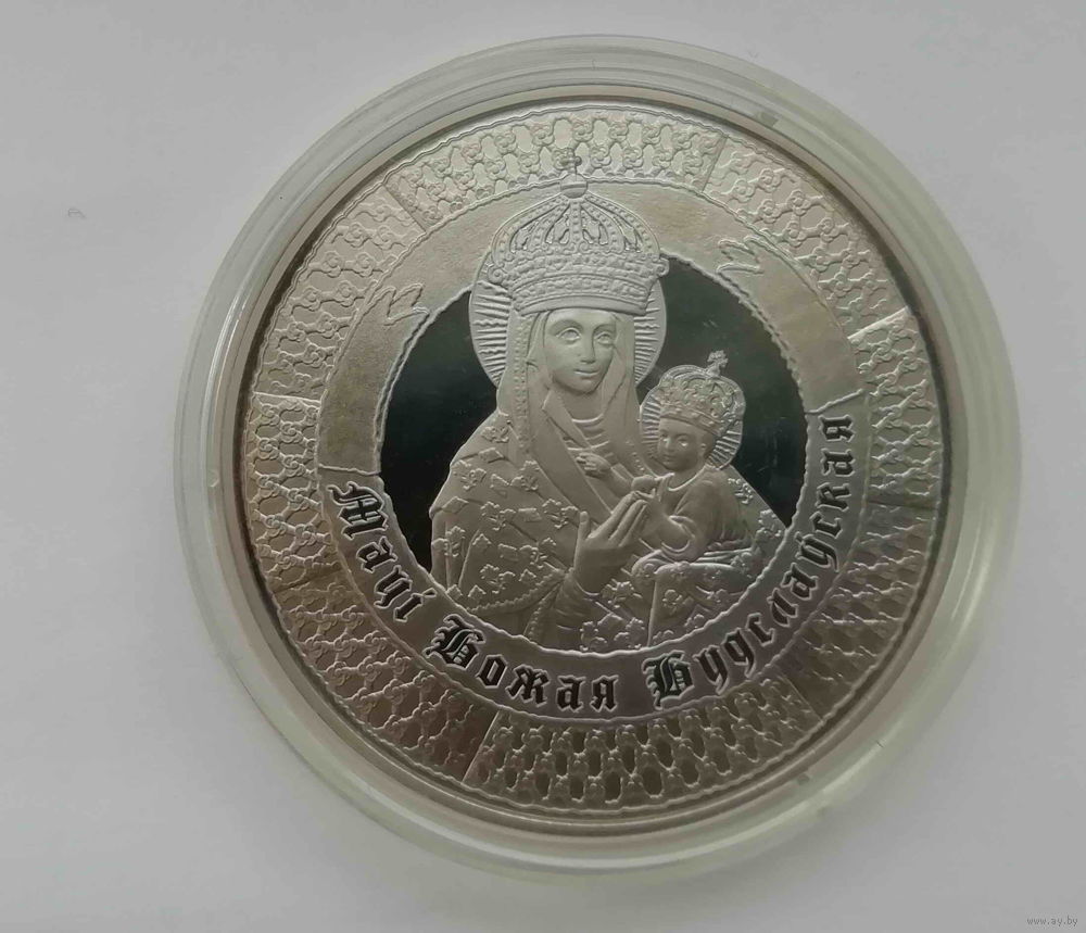 Монета имеет форму круга, с лицевой и оборотной сторон - выступающий кант по окружности. На боковой поверхности монет надпись: 400 ГАДОЎ ПРАБЫВАННЯ ЦУДАТВОРНАГА АБРАЗА МАЦІ БОЖАЙ У БУДСЛАВЕ.