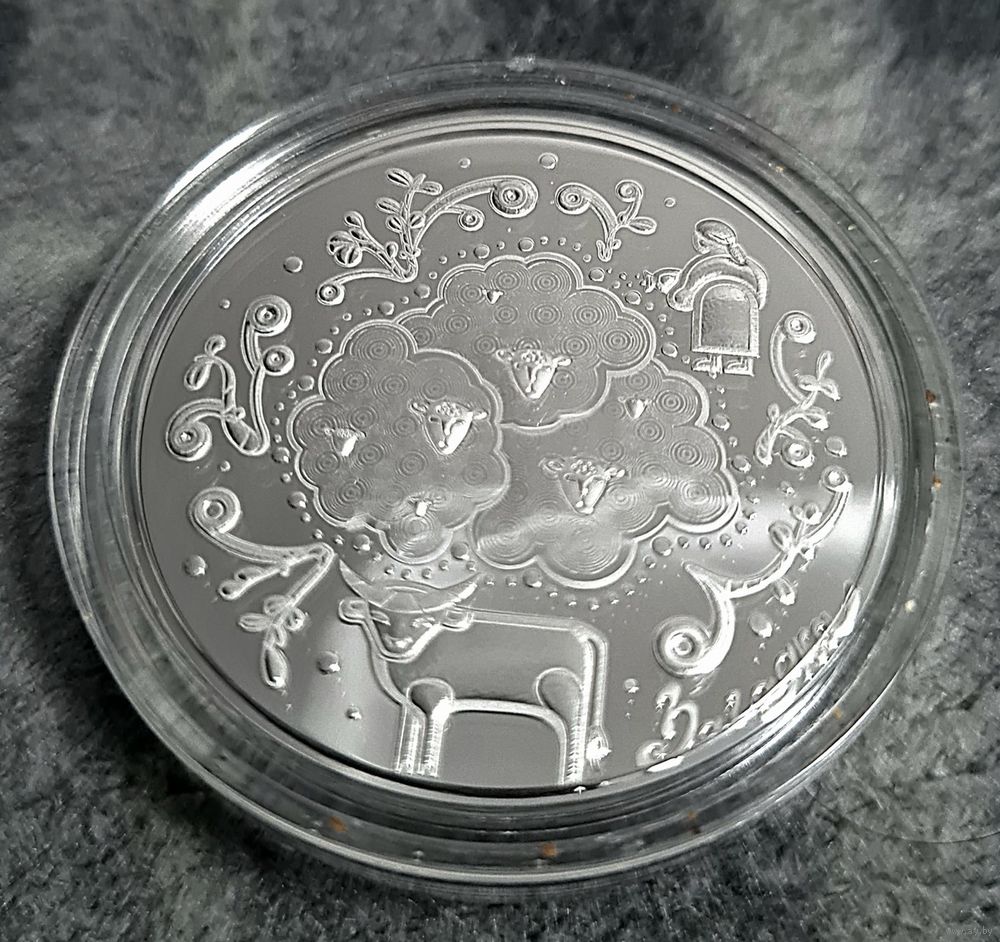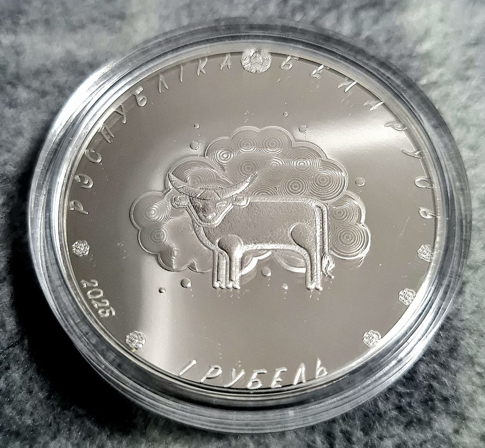 По кругу вверху – рельефное изображение Государственного герба Республики Беларусь и надпись: РЭСПУБЛІКА БЕЛАРУСЬ; в центре – стилизованное изображение быка и силуэты овец; внизу – номинал 20 РУБЛЁЎ (на серебряной) и 1 РУБЕЛЬ (на медно-никелевой), справа – проба сплава (на серебряной), слева – год чеканки.