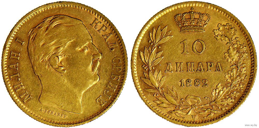 10 динаров 1882 г. Милан I. Королевство Сербия (1882 - 1917). Золото. Редкие! KM# 16.