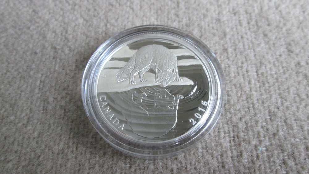 Дизайн: На реверсе изображена полярная лиса, склонившаяся к воде, а специальная техника отделки создает эффект отражения на ряби воды. Дизайнер изображения — канадская художница Моро де Бейнтон (Maurade Baynton).