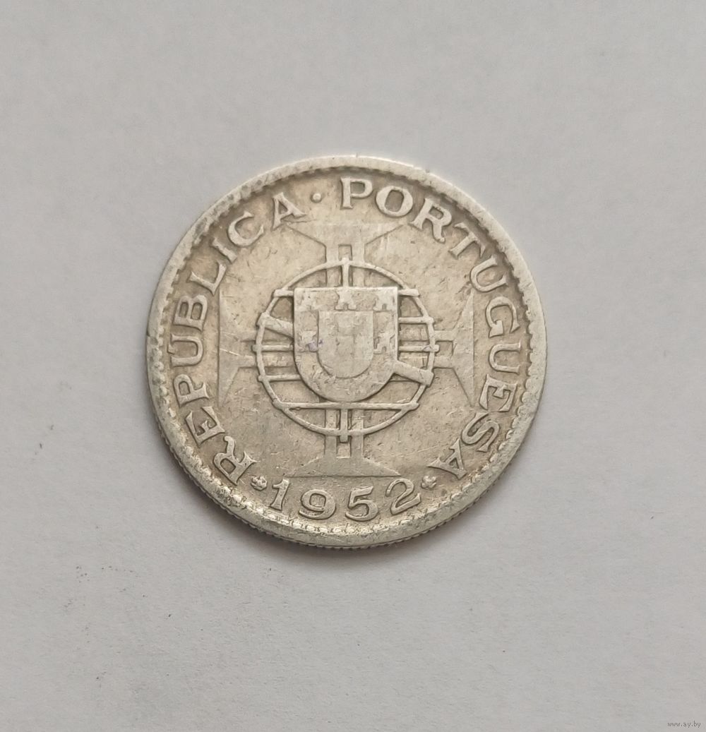 10 эскудо. 1952г. 720пр., серебра. Ангола. Не чищена.
