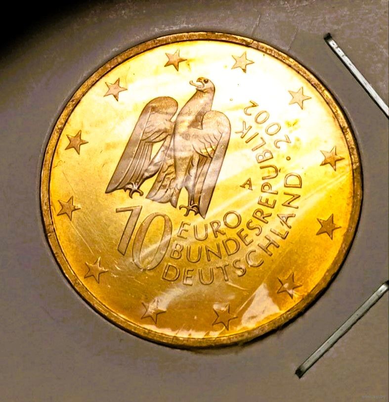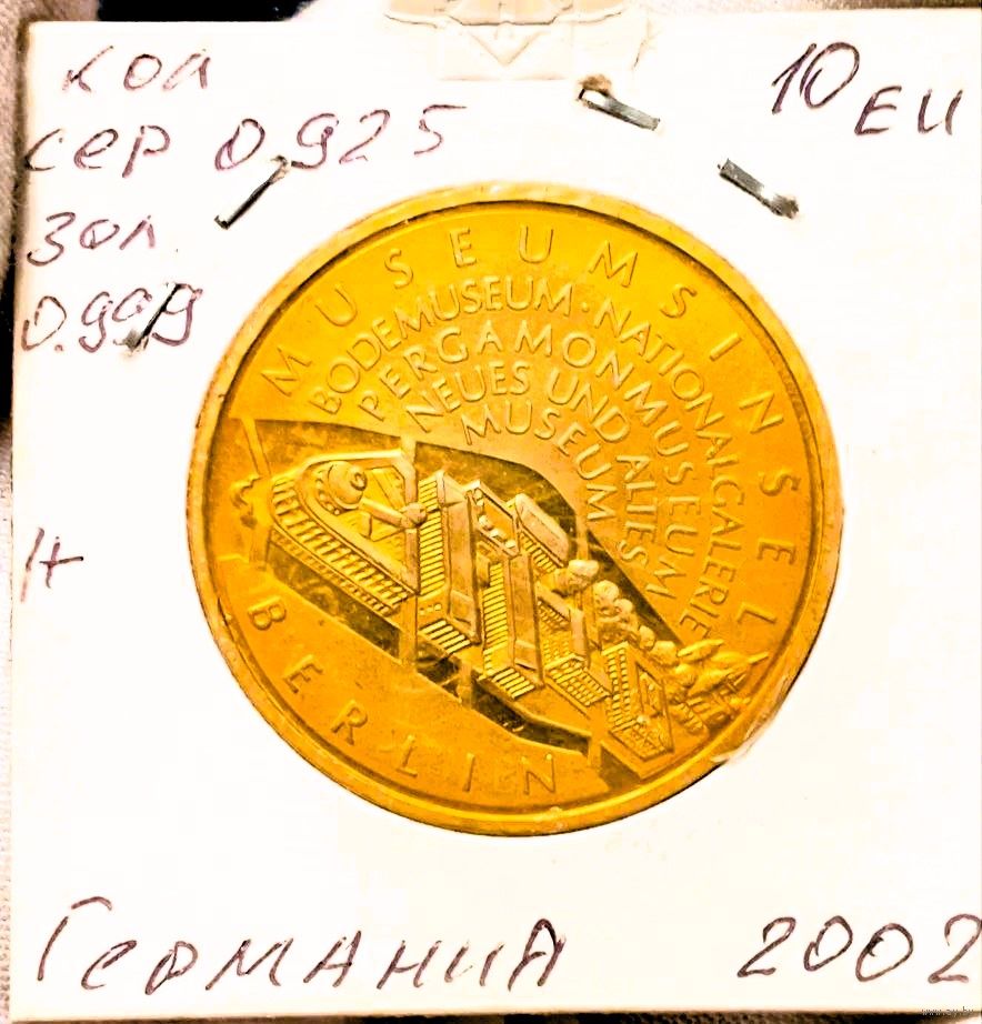 Коллекционная монета, 10 евро 2002, Германия "Берлинский музей", улучшенный чекан, серебро 925 пробы, вес 18 гр., незначительный, ограниченный тираж данной монеты был выпущен с покрытием золотом 999 пробы (основной тираж - серебряные монеты без покрытия золотом)! великолепный экземпляр в коллекцию и отличная инвестиция!