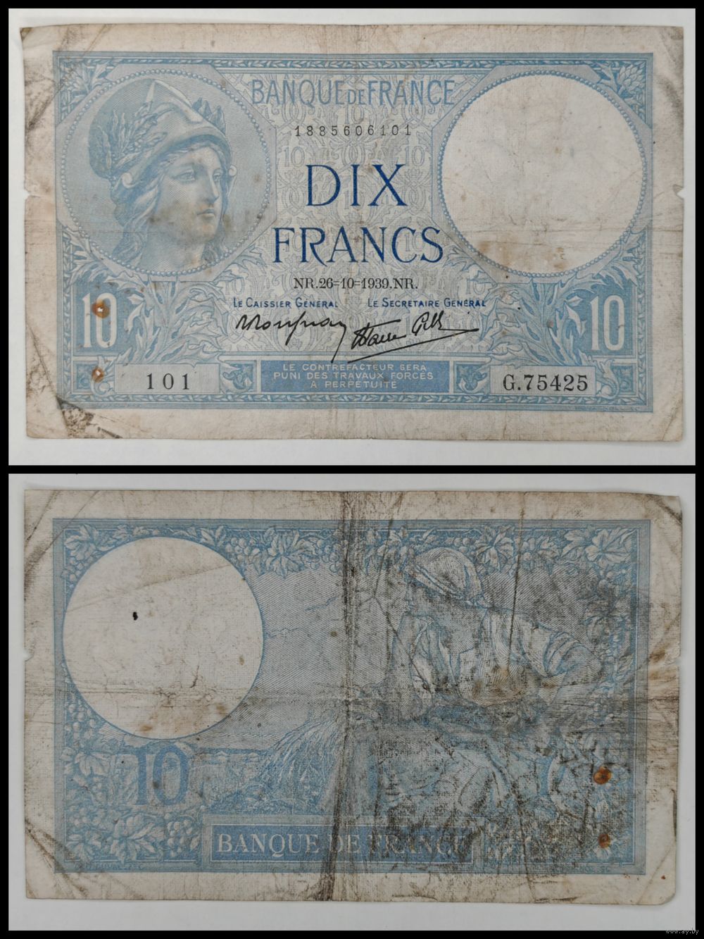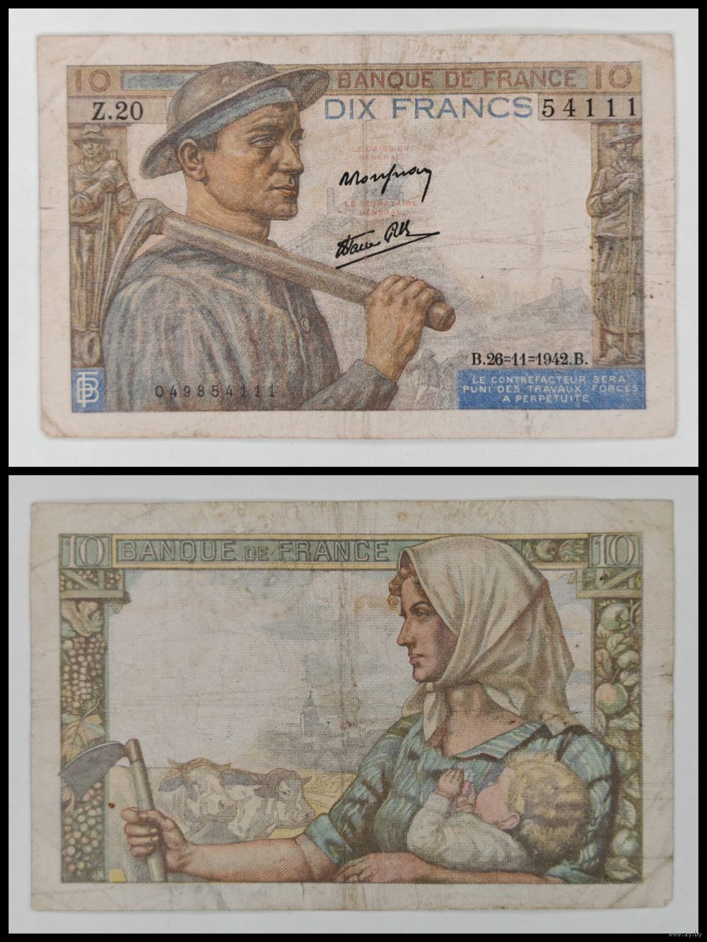 10 франков 1939-1942 гг. Франция. Одним лотом. С рубля.