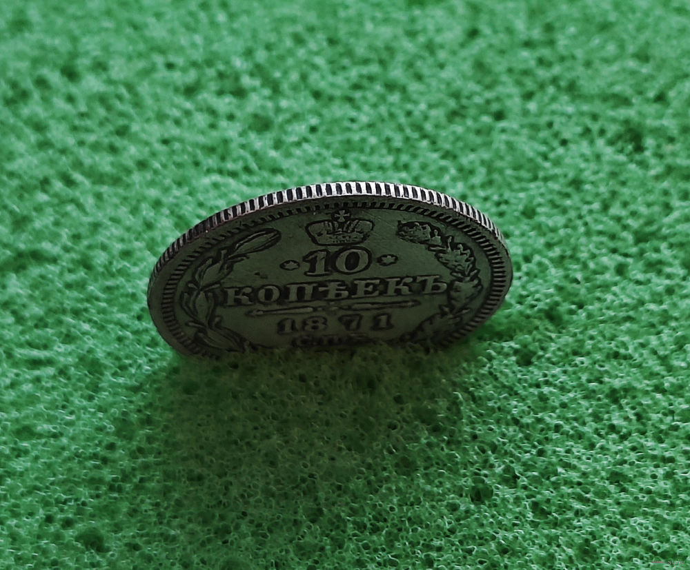 Перед нами монета 10 копеек, выпущенная в 1871 году Санкт-Петербургским монетным двором (СПБ), в 1871 году введена в обращение.
