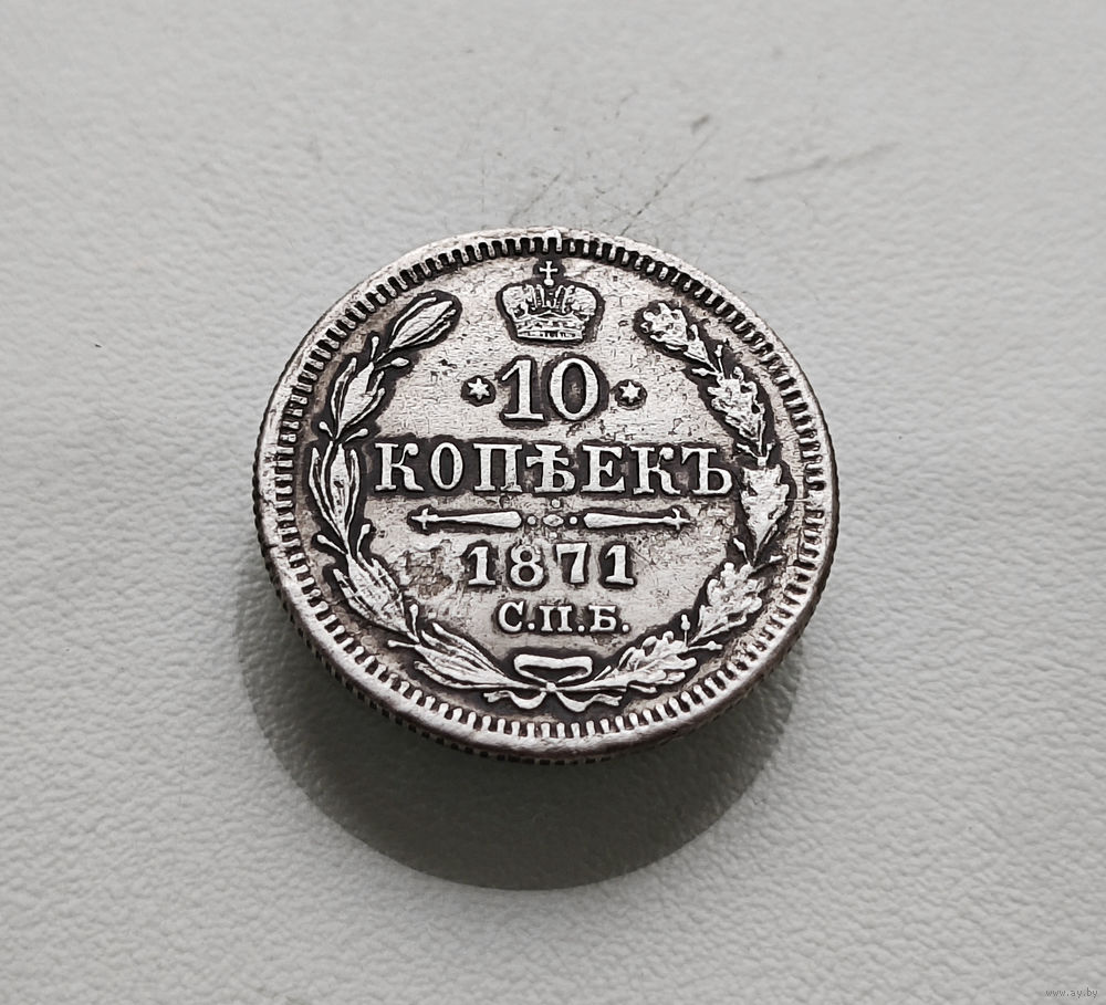 Перед нами монета 10 копеек, выпущенная в 1871 году Санкт-Петербургским монетным двором (СПБ), в 1871 году введена в обращение.