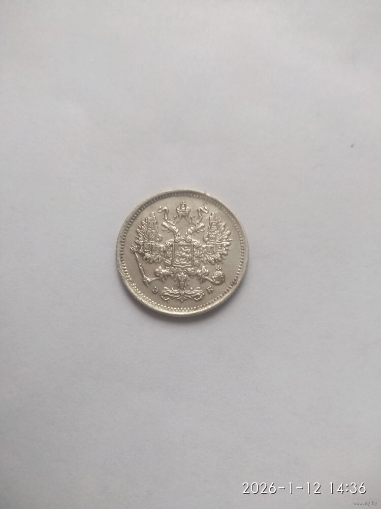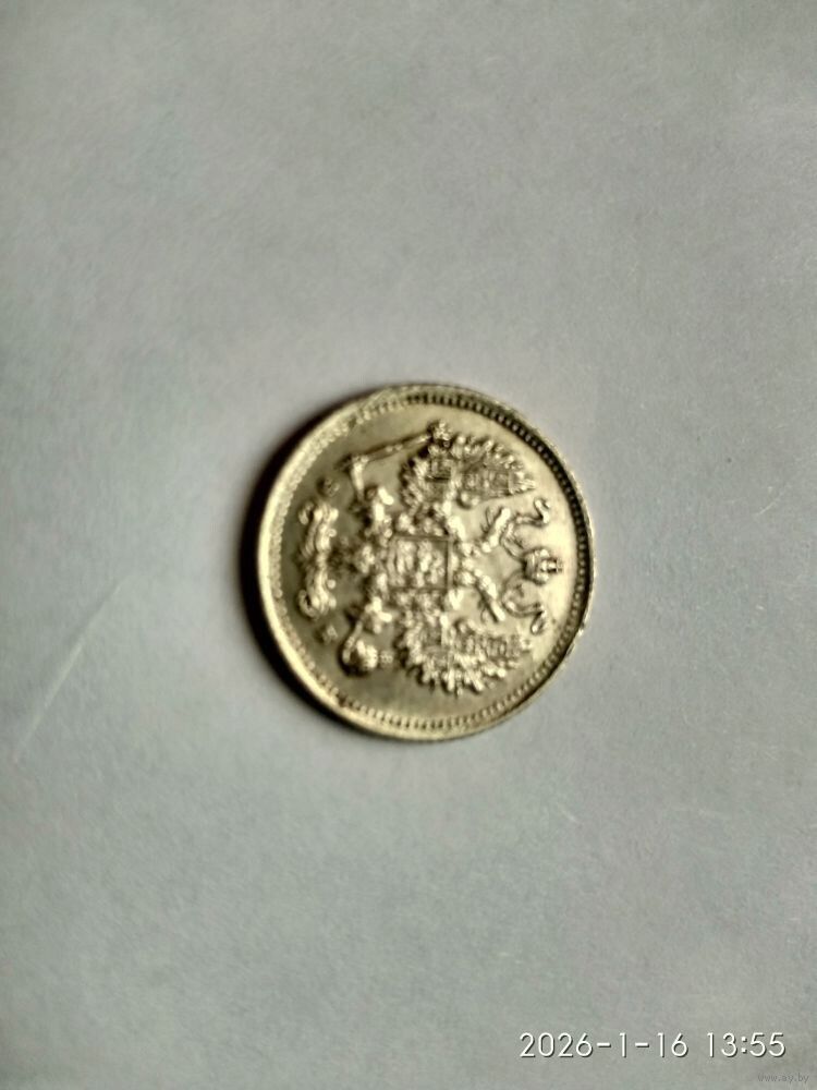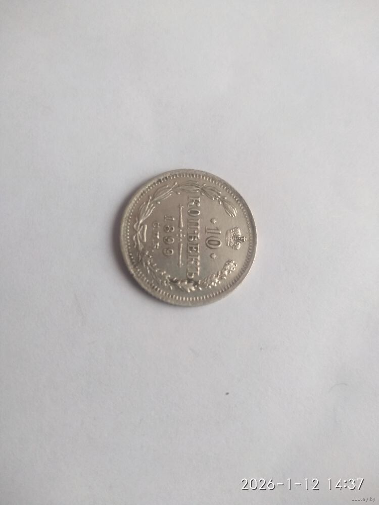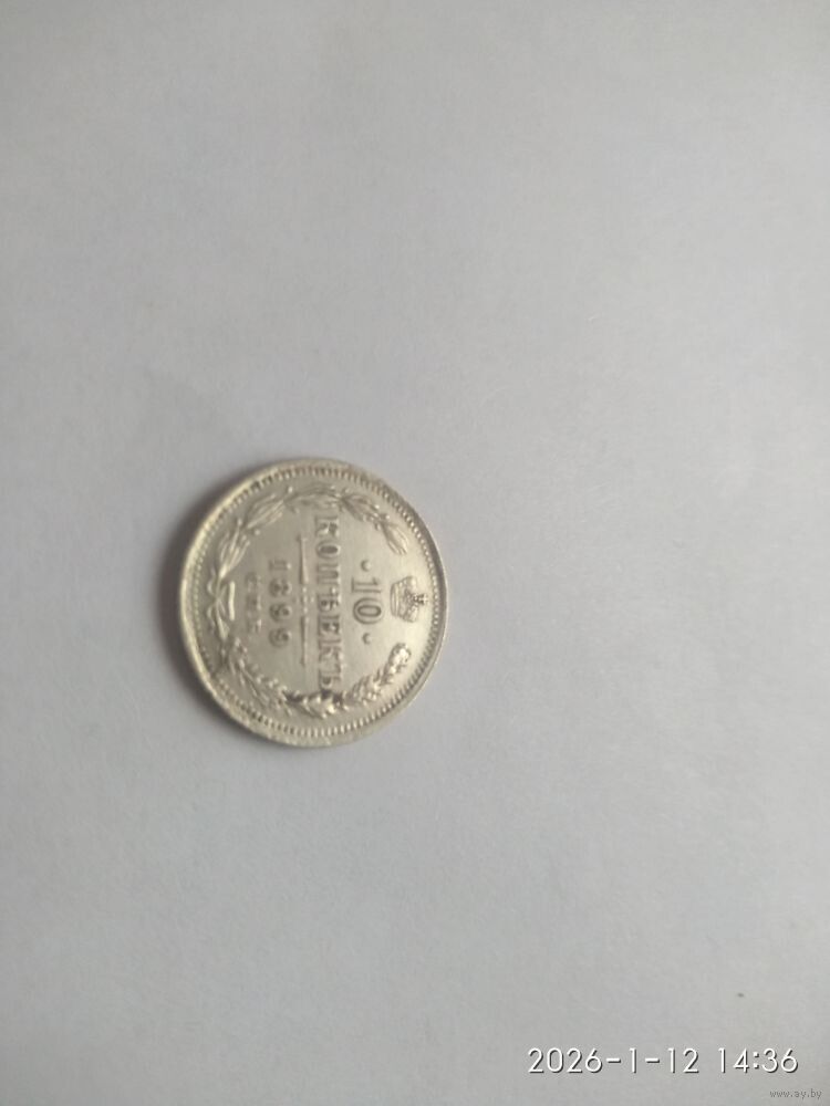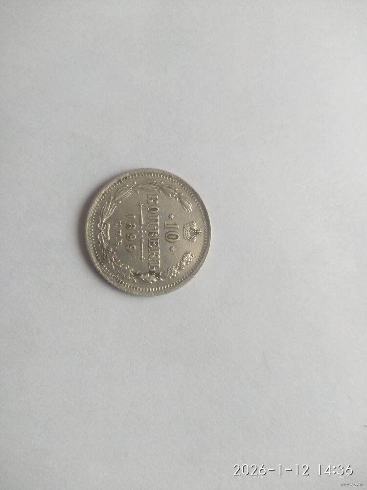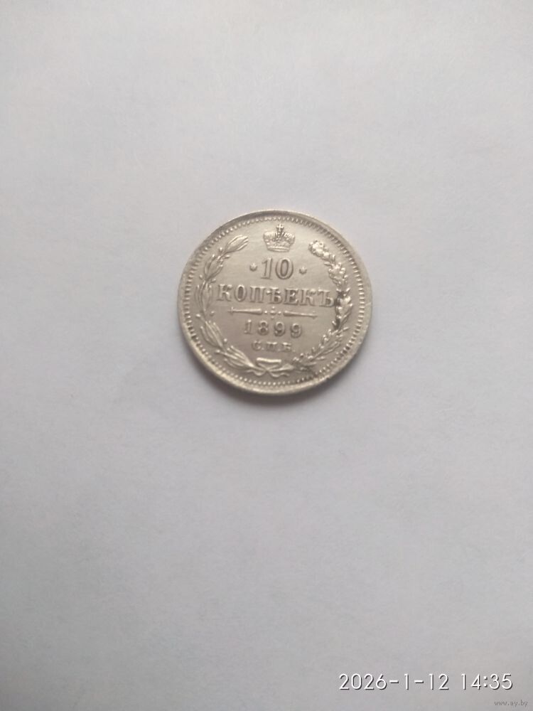 Аверс: В верхней части Реверс:а расположена корона Российской империи. Ниже на двух строках обозначен номинал (шестиконечные звёзды слева и справа) и денежная единица : 10 КОПѢЕКЪ Ниже находится элемент — разделитель, состоящий из двух разнонаправленных стрелок и пяти точек между ними. Пять точек образуют крест. Под разделителем — год чеканки «1899». Под годом — аббревиатура «С.П.Б.» (Санкт-Петербургский монетный двор). В левой части монеты вдоль края находится лавровая ветвь, а в правой дубовая. У основания ветви связаны лентой, которая образует аккуратный бант. По всему краю монеты отчеканены выступающие зубцы.