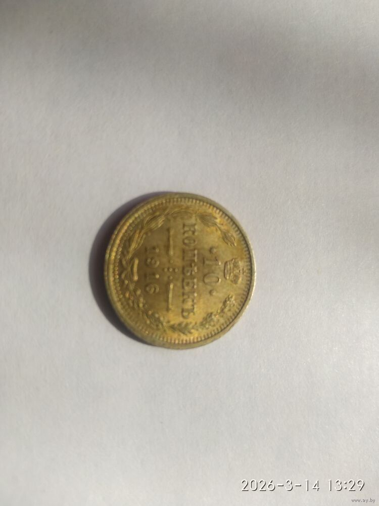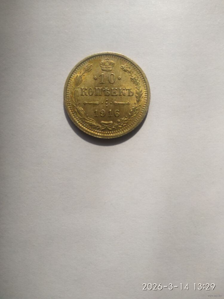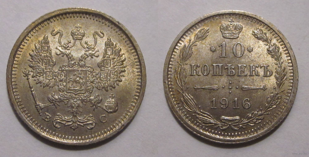 Аверс: В верхней части Реверс:а расположена корона Российской империи. Ниже на двух строках обозначен номинал (шестиконечные звёзды слева и справа) и денежная единица : 10 КОПѢЕКЪ Ниже находится элемент — разделитель, состоящий из двух разнонаправленных стрелок и пяти точек между ними. Пять точек образуют крест. Под разделителем — год чеканки «1916». В левой части монеты вдоль края находится лавровая ветвь, а в правой дубовая. У основания ветви связаны лентой, которая образует аккуратный бант. По всему краю монеты отчеканены выступающие зубцы.