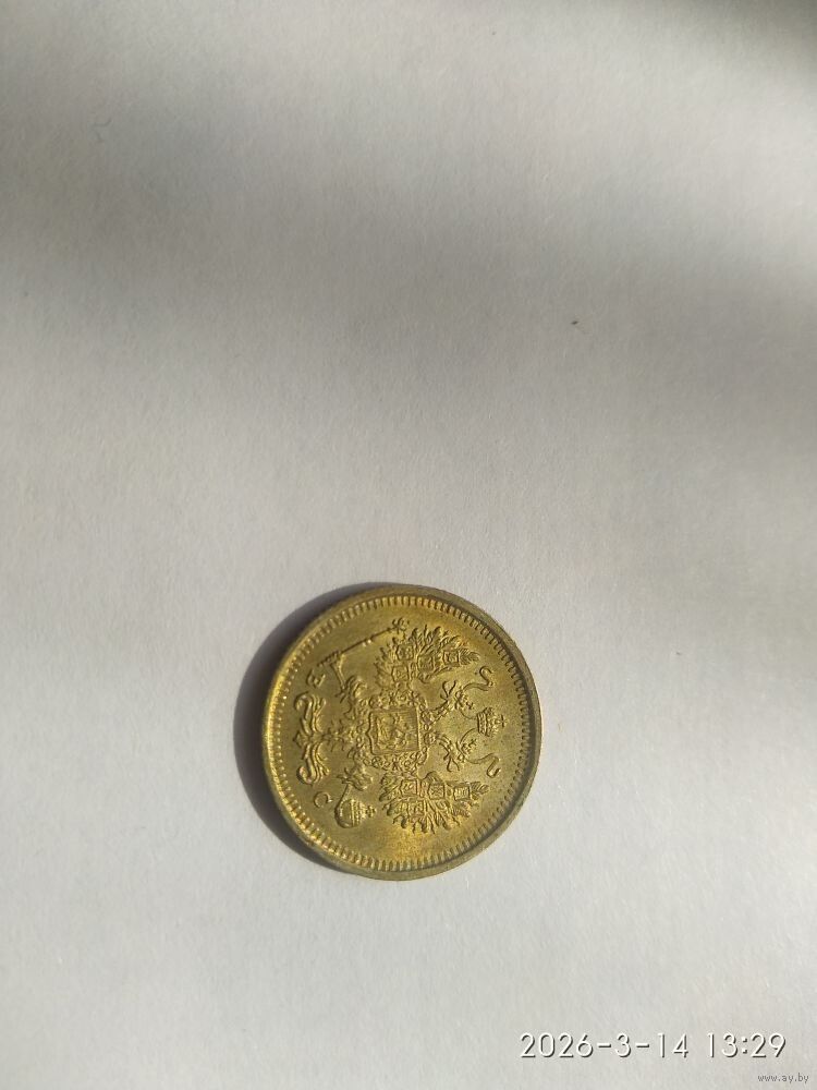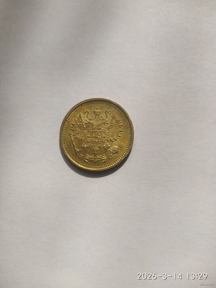 Реверс: Центр аверса занят малым гербом Российской империи — двуглавым орлом. Обе головы орла несут короны, а третья корона большего размера находится над и между головами. Все они соединены орденской лентой ордена Св. Апостола Андрея Первозванного. На груди орла расположен Московский герб, в щите изображен Георгий Победоносец с копьем поражающий дракона. Вокруг щита цепь ордена Святого апостола Андрея Первозванного. Гербы на крыльях (по четыре на каждом крыле): Казанский Польский Таврический Астраханский Сибирский Грузинский Киевский и Новгородский Владимирский В правой лапе орла — скипетр, а в левой — держава. Под правой лапой – буква «В», под левой – буква «С». Инициалы минцмейстера Виктора Смирнова. Буртик украшен зубчиками. ВЫХОД НА СВЯЗЬ 2 ДН. ОПЛАТА 3 ДН.