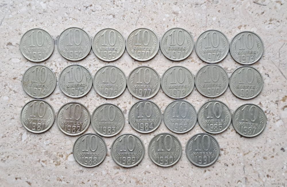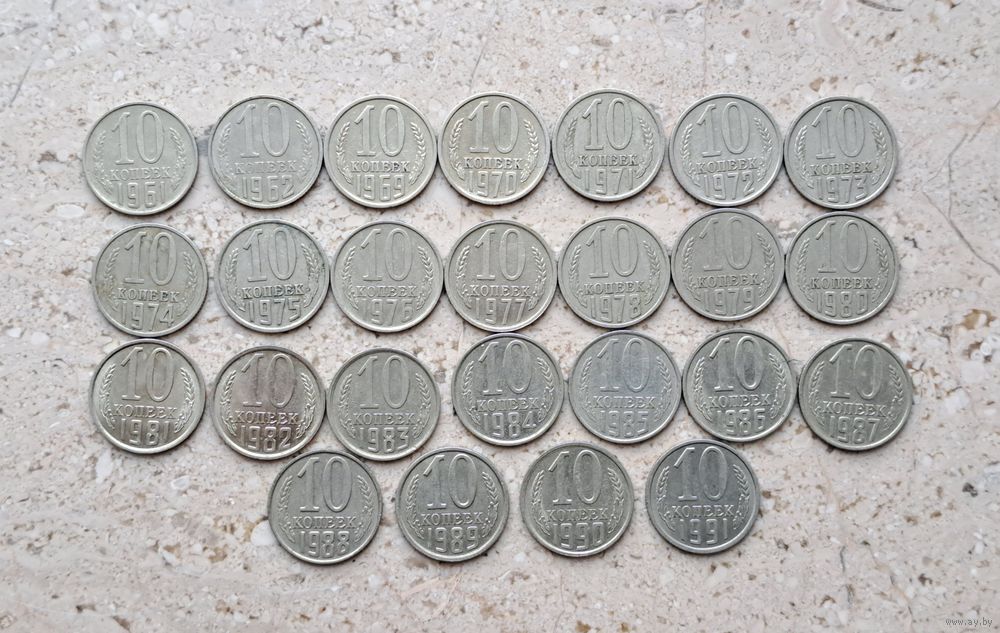 СССР 25 монет: 10 копеек 1961 1962 1969 1970 1971 1972 1973 1974 1975 1976 1977 1978 1979 1980 1981 1982 1983 1984 1985 1986 1987 1988 1989 1990 1991 (1961. 1962. 1969 - 1991.)