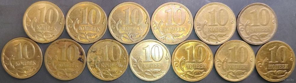 Описание реверса: В середине сдвинутая вправо и вверх цифра «10», обозначающая достоинство монеты, ниже надпись «КОПЕЕК». Внизу, слева и справа завитки растительного орнамента