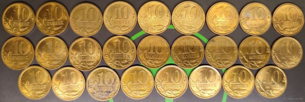 Описание реверса: В середине сдвинутая вправо и вверх цифра «10», обозначающая достоинство монеты, ниже надпись «КОПЕЕК». Внизу, слева и справа завитки растительного орнамента