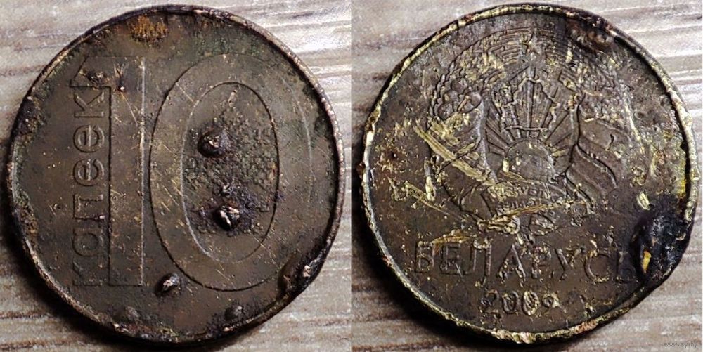 - 10 копеек 2009 РБ - 1шт (фото №3-4). Вздутия и наплывы верхнего слоя плакировки аверса, реверса и гурта. У аверса "асфальтная болезнь"