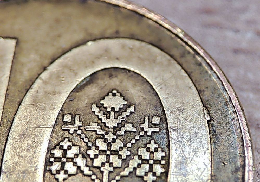 Описание реверса: В центре – цифровое обозначение номинала – «10», слева от цифры 1 вертикально расположена надпись – «КАПЕЕК»; в цифре 0 – стилизованное изображение национального орнамента