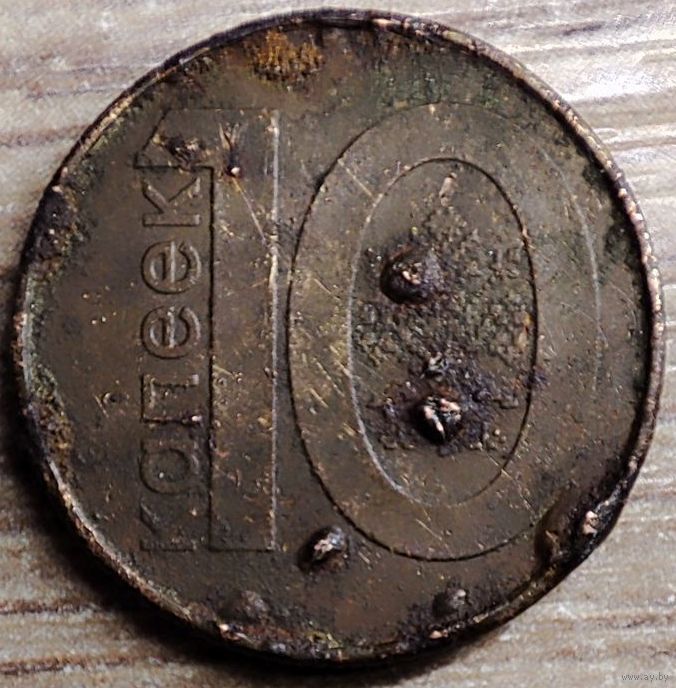 10 копеек 2009 Республика Беларусь (магнитная). Монета вышла в обращение в 2016 году. Вздутия верхнего слоя плакировки аверса, реверса и гурта. У аверса асфальтная болезнь. Монета с обеих сторон запатинирована