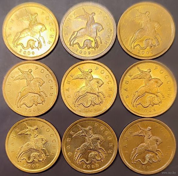 Описание аверса: Слева вдоль выступающего канта слово «БАНК», справа «РОССИИ», внизу год выпуска «2009», в центре Георгий Победоносец колющий копьем змея, под передней ногой коня буквенное обозначение монетного двора «С-П» (СПМД)