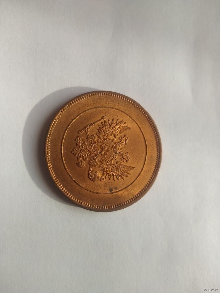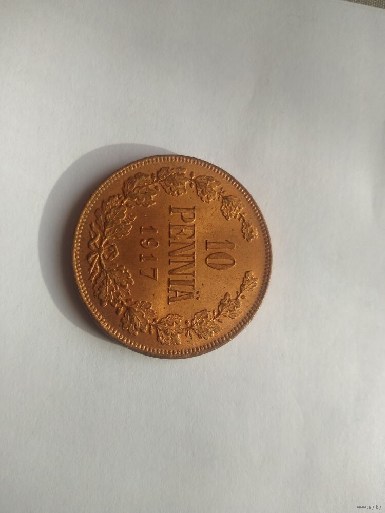 Аверс: В центре — надпись в три строки: 10 PENNIÄ 1917 По левому и правому краям монеты расположен венок из дубовых ветвей, которые не касаются друг друга в верхней части. У основания ветви связаны лентой, которая образует двойной бант. Буртик монеты украшен выступающими зубцами.