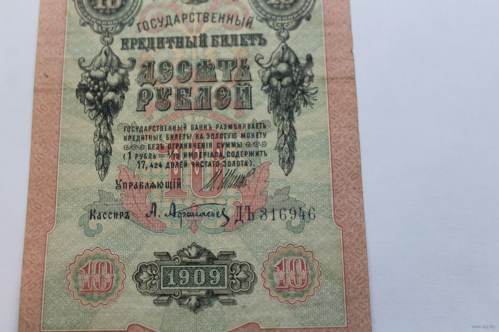 10 рублей 1909 Шипов/Афанасьев. Серия ДЪ.Возможен обмен на других управляющих/кассиров.
