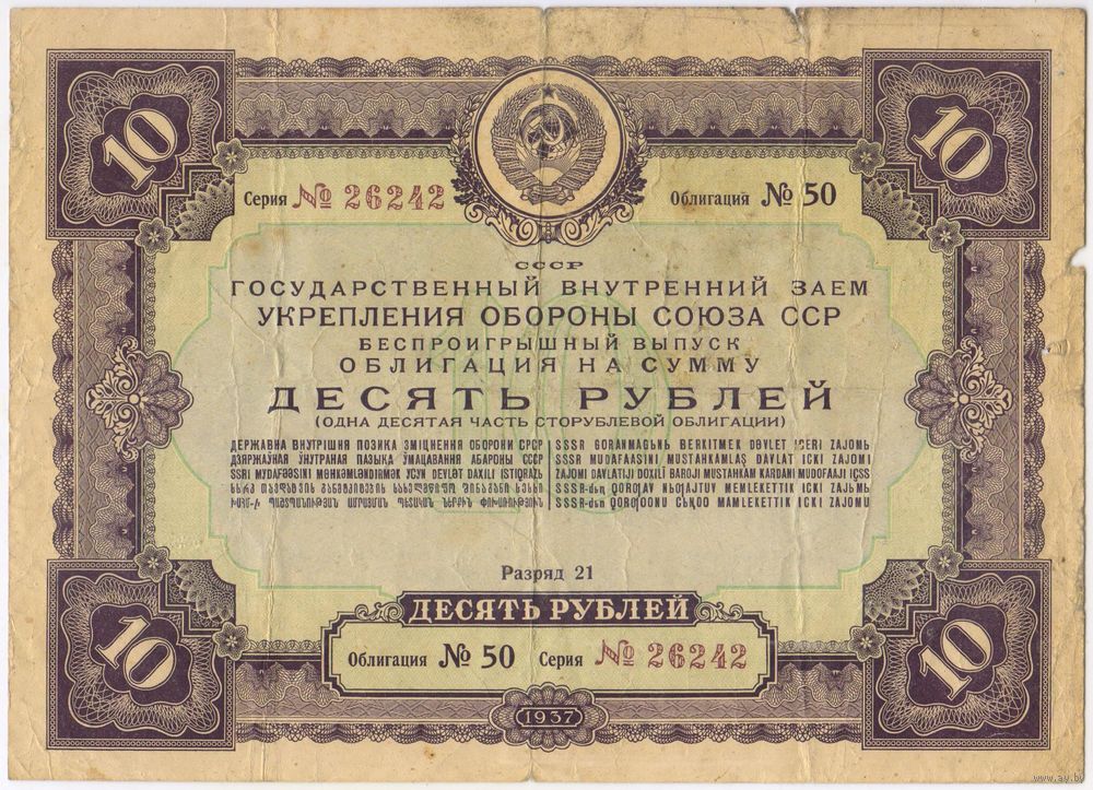 10 рублей 1937 год. Облигация. Государственный внутренний укрепления обороны союза СССР
