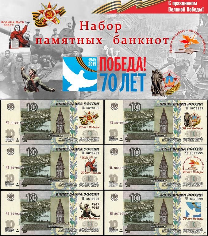 * 10 Рублей 1997 - 2015 ! 70 Лет Победы 1945 ! Набор 6 банкнот ! UNC !