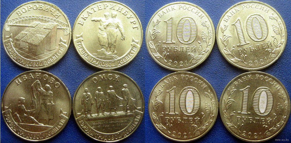 10 рублей 2021 Города Трудовой Доблести : Боровичи, Екатеринбург, Иваново, Омск. Одним лотом. UNC