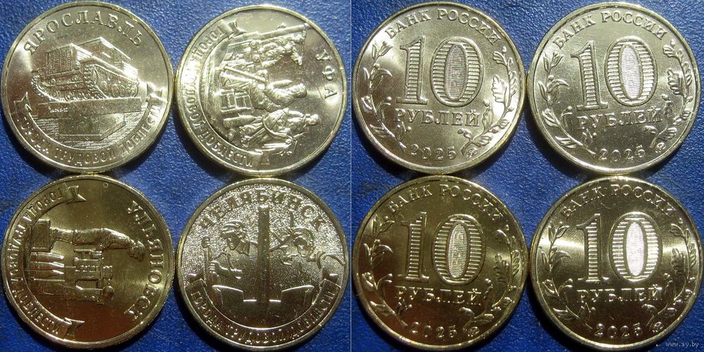 10 рублей 2025 Города Трудовой Доблести : Ульяновск, Уфа, Челябинск, Ярославль. Одним лотом. UNC