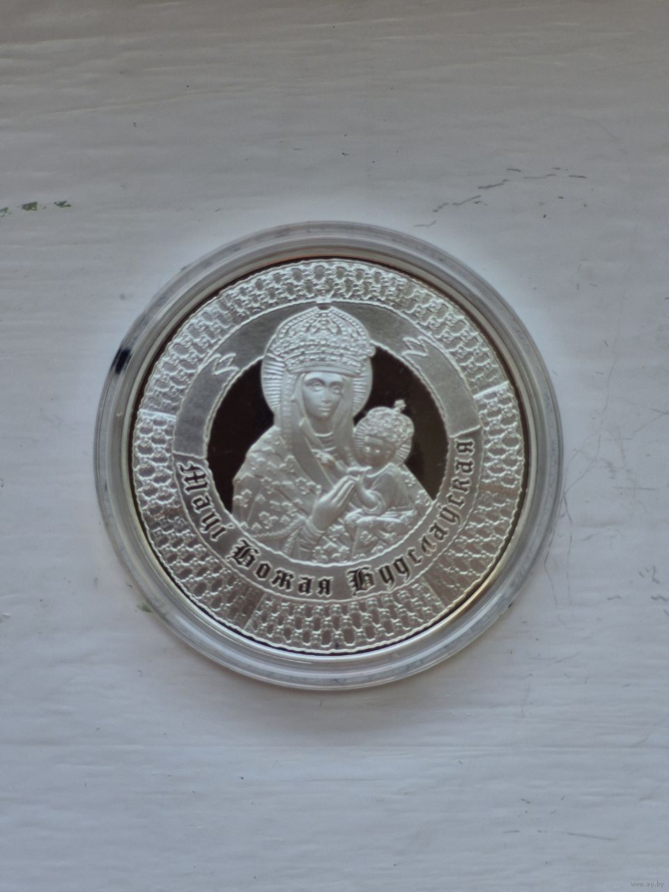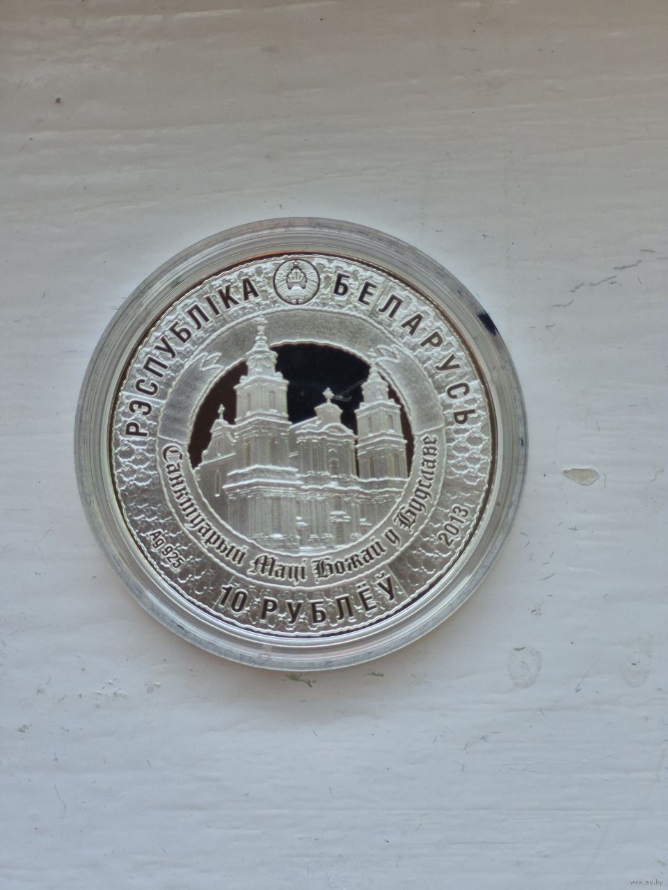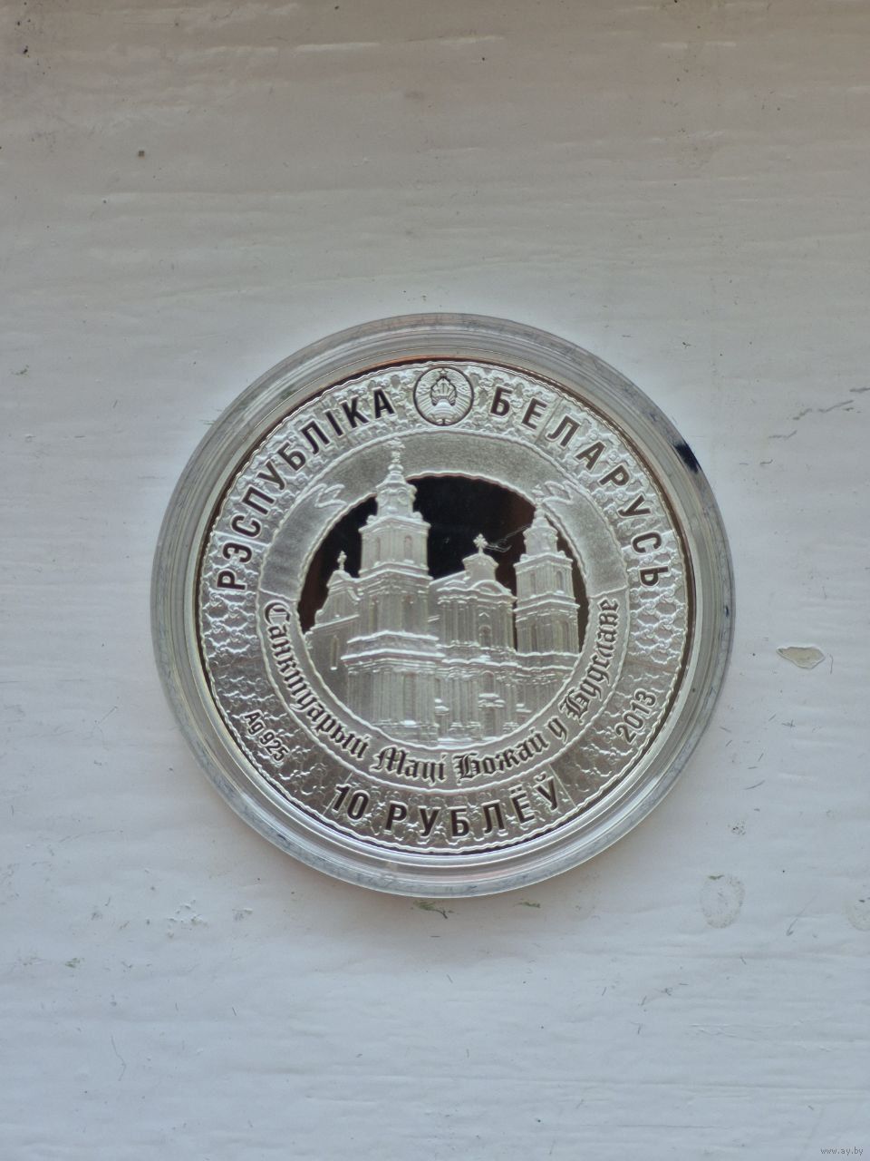Памятная монета 10 рублей РБ 2013 года, посвящена 400 летию нахождения чудотворной иконы Божьей Матери в Будслове. Ag 925. Монета в капсуле, сертификат, футляр.