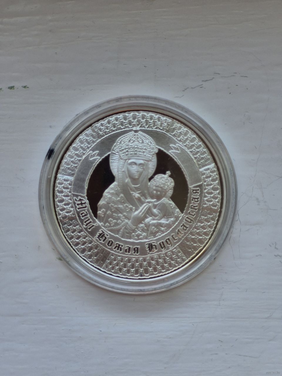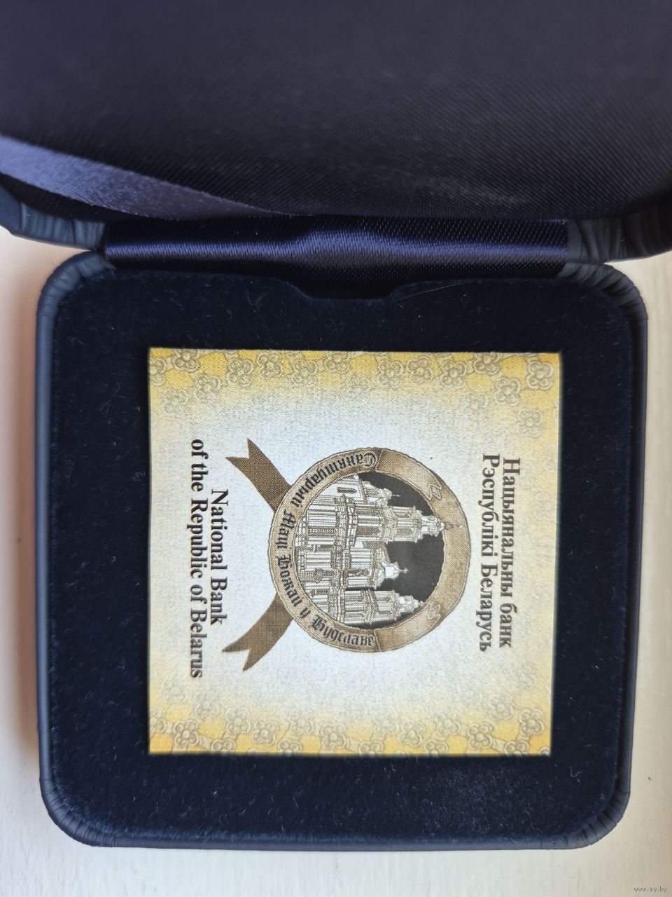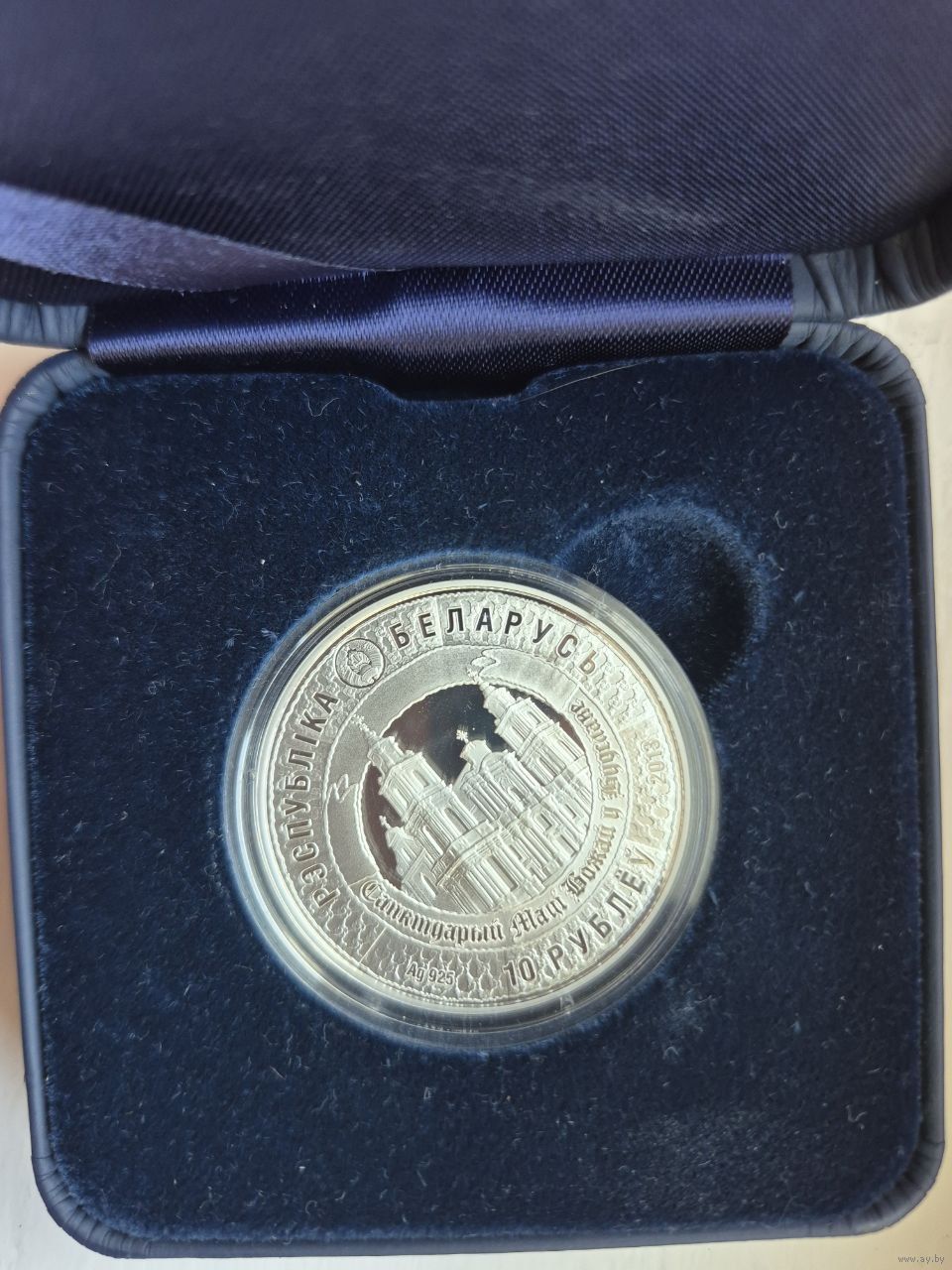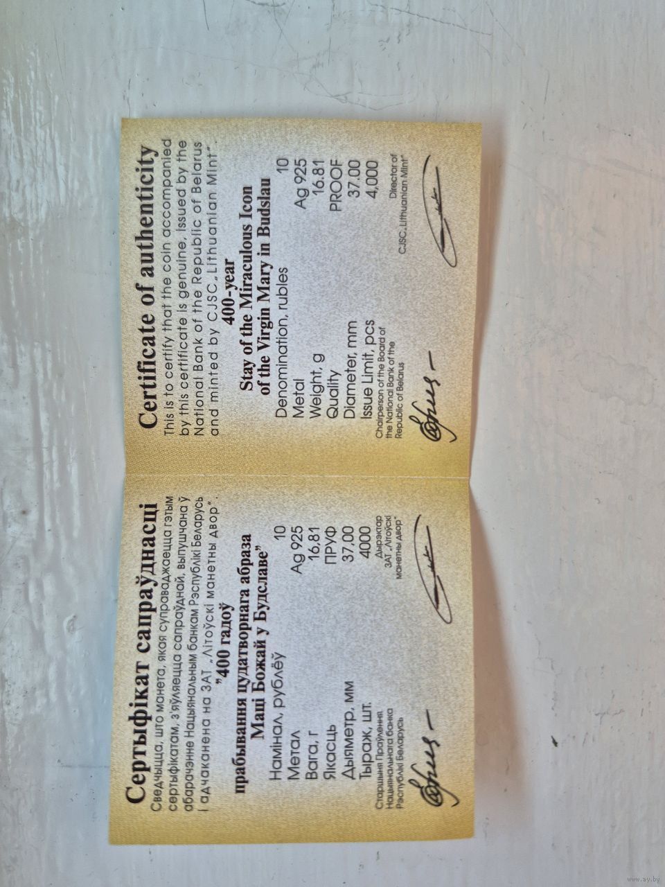 Памятная монета 10 рублей РБ 2013 года, посвящена 400 летию нахождения чудотворной иконы Божьей Матери в Будслове. Ag 925. Монета в капсуле, сертификат, футляр.