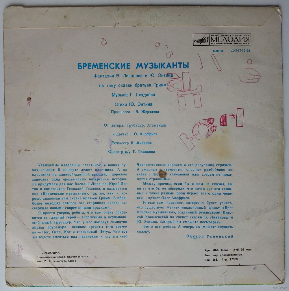 Уважаемые владельцы пластинок, в ваших руках — конверт. В конверте лежит пластинка. А на пластинке на длинной-длинной вьющейся дорожке записана одна черезвычайно интересная история. Ее придумали для вас Василий Ливанов, Юрий Энтин и композитор Геннадий Гладков, и называется она «Бременские музыканты», так же, как и хорошо знакомая вам сказка братьев Гримм. В обработке молодых актеров эта старинная сказка засверкала новыми современными красками.