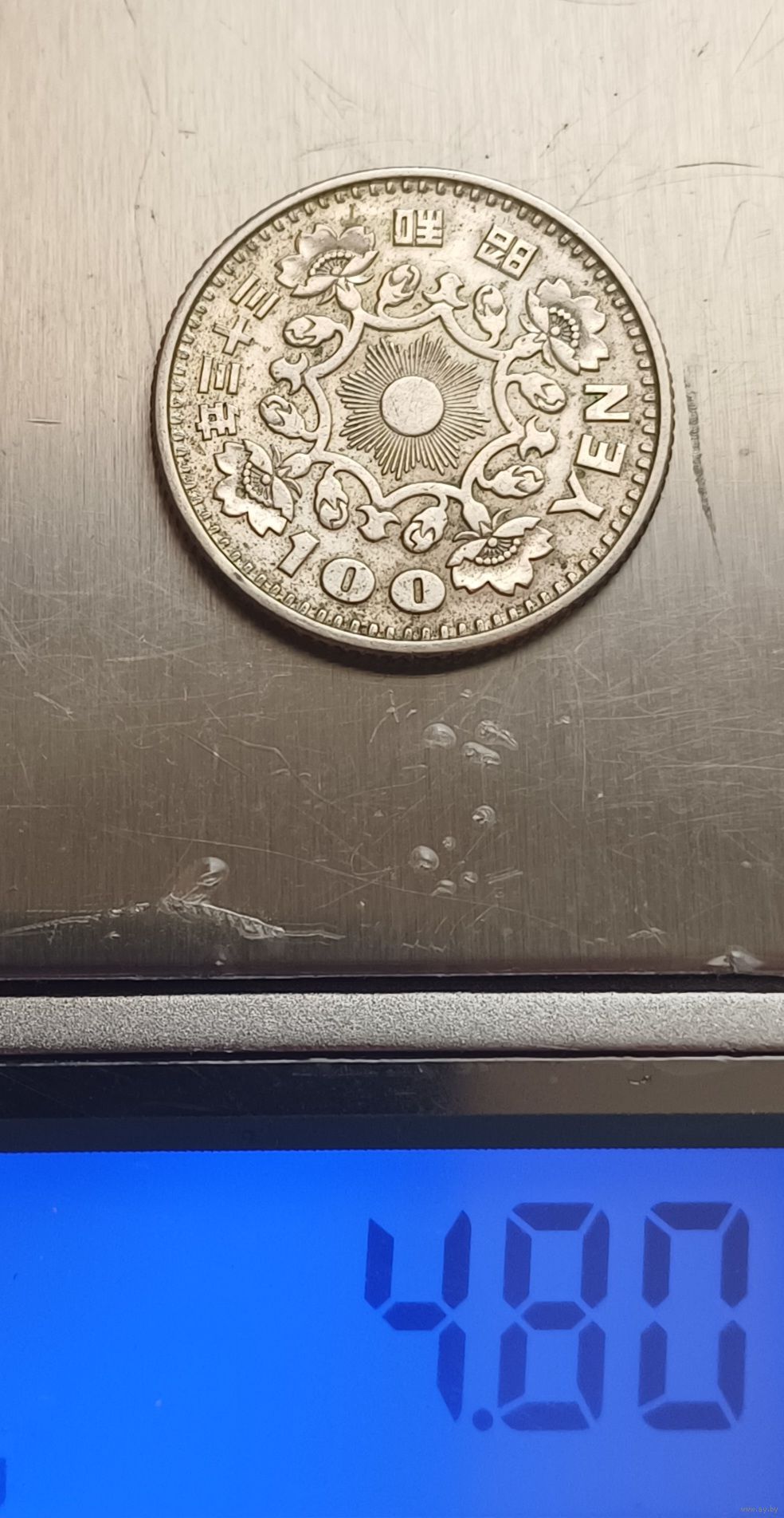 100 йен. 1958г(33-ый год эпохи Сёва).600 пр., серебра. Япония.Феникс (Бессмертная птица, возрождающаяся из пепла).Не чищена.