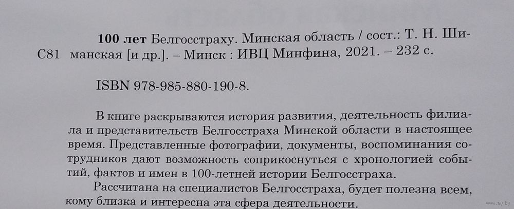 100 лет Белгосстраху. Минская область. Составители: Т. Н. Шиманская и др. Минск : ИВЦ Минфина, 2021 г. 231 с. Твердый переплет, Энц.формат