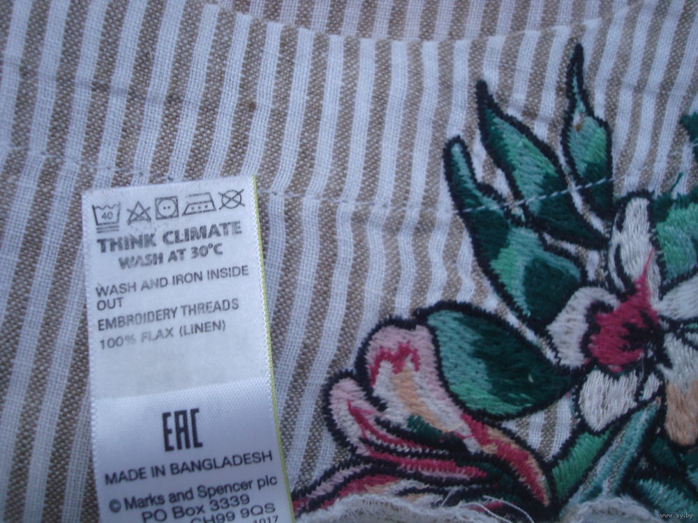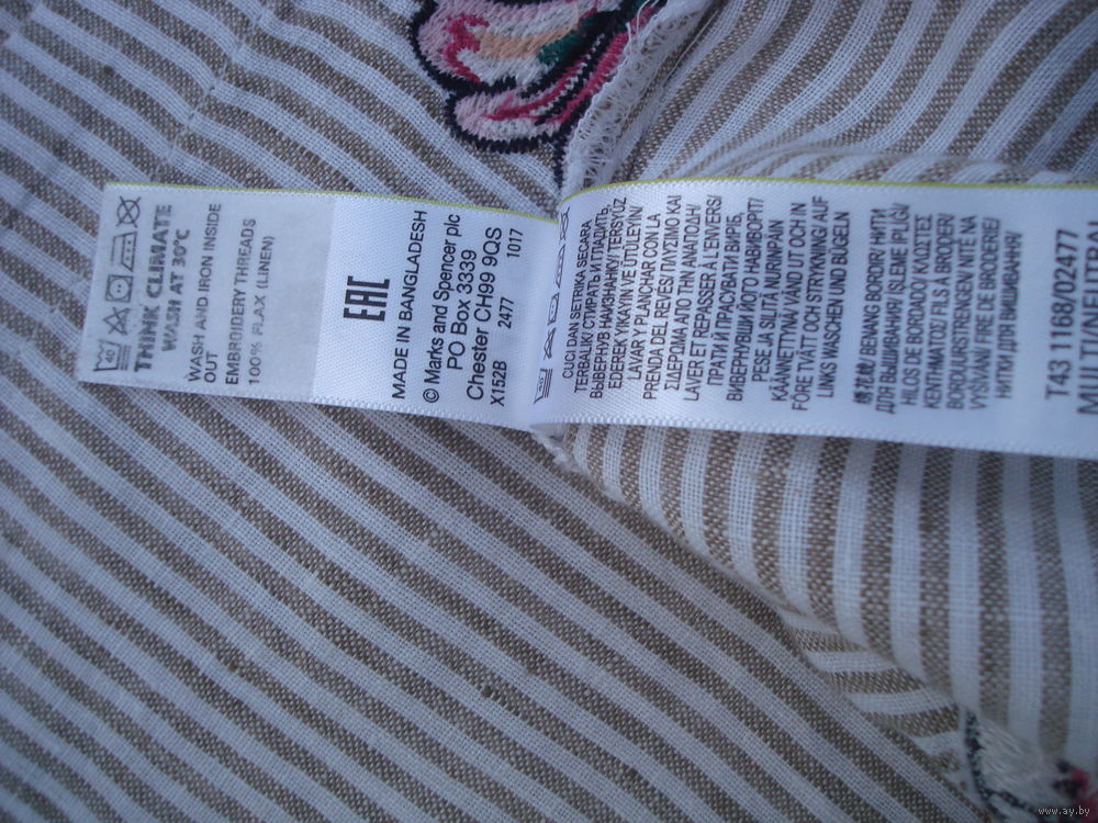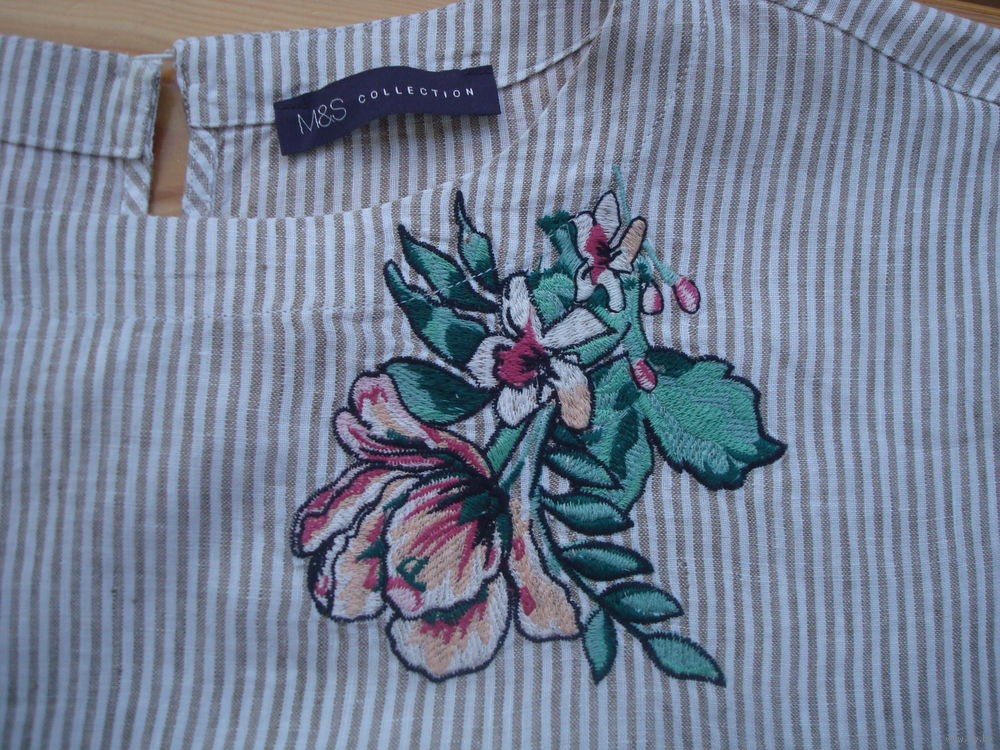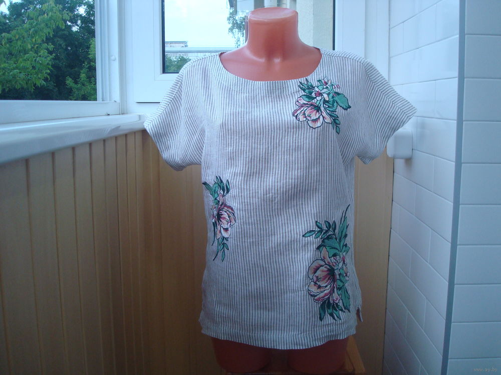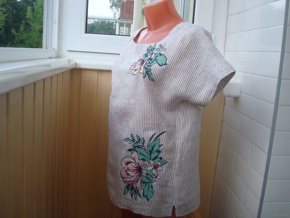 Отличный "льняной" натуральный цвет: ткань в бело-бежевую нежную полоску(на каких-то фото есть голубизна, а в реалии бело-бежевый цвет). Сзади застегивается на пуговку. По бокам внизу небольшие разрезики. Спереди вышивка гладью - три цветочные композиции. Очень красиво и необычно.