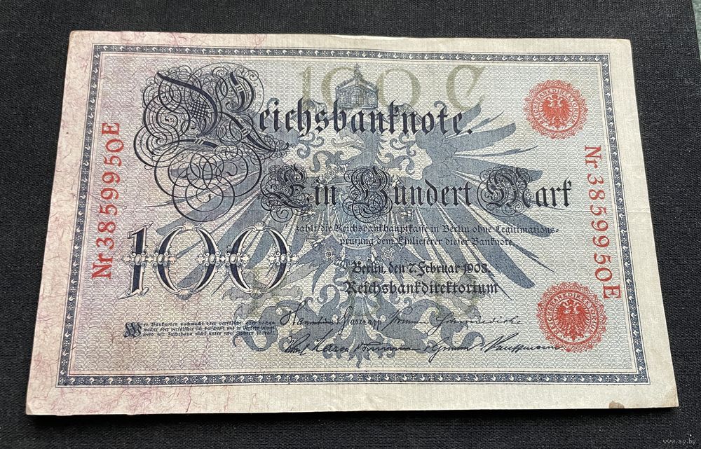 100 марок 1908 год / Германская империя банкнота тип 1883 года Blauer Hunderter / номер семь знаков, красная печать (3)