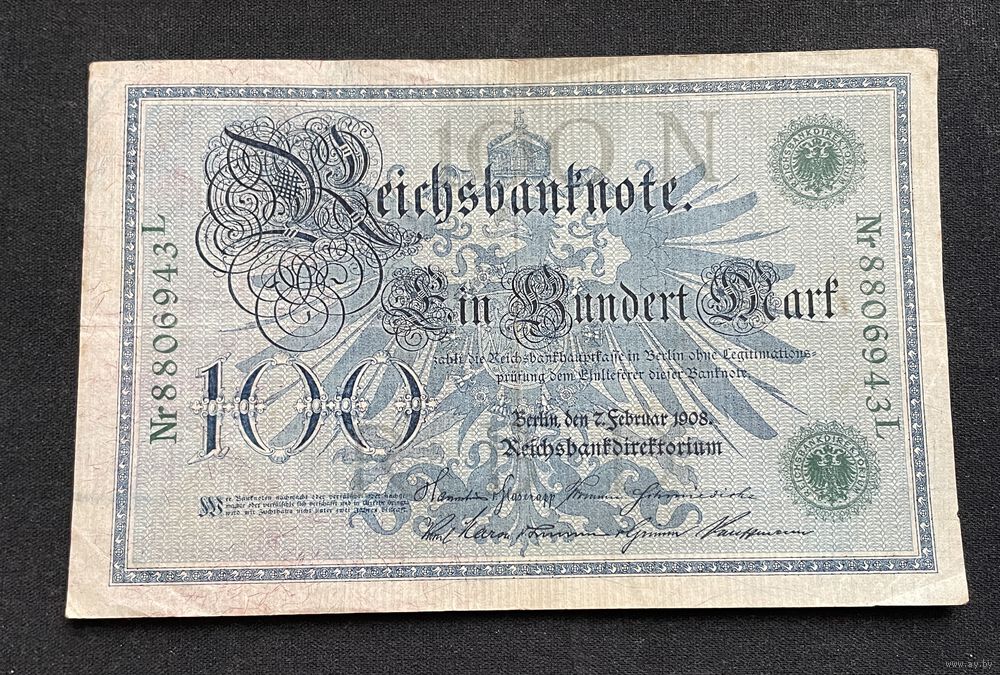 100 марок 1908 год / Германская империя банкнота тип 1883 года Blauer Hunderter / номер семь знаков, зелёная печать (1)