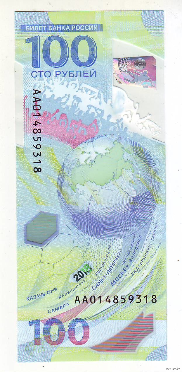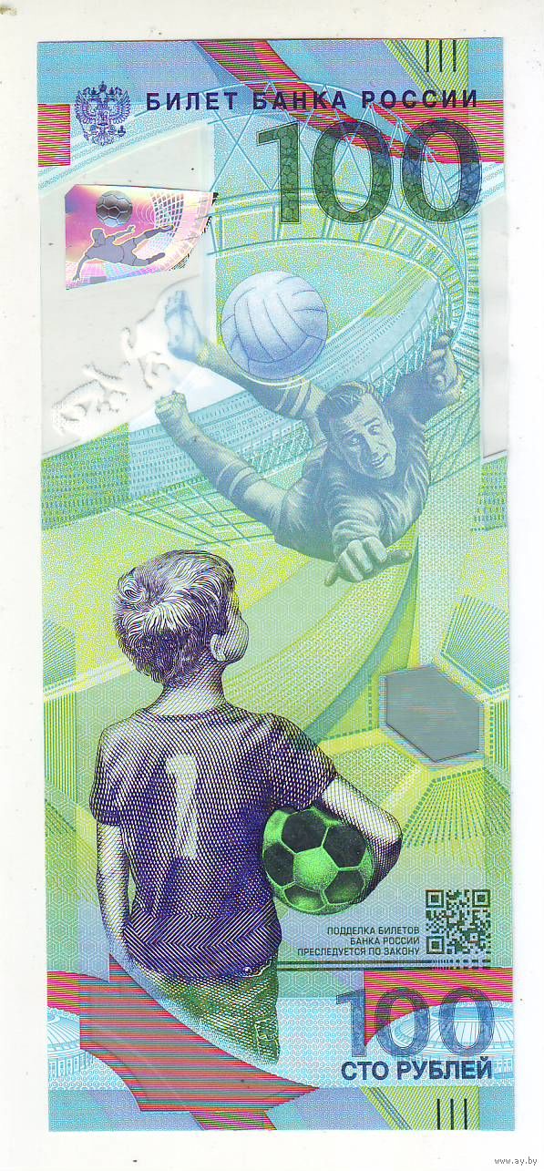 100 рублей 2018 год , чемпионат мира по футболу, пластик - состояние !