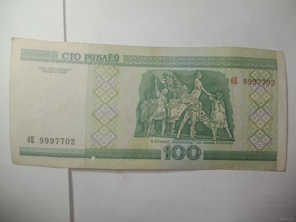 100 рублей Беларусь 2000 года . Серия бЕ 9997702 . Интересный номер